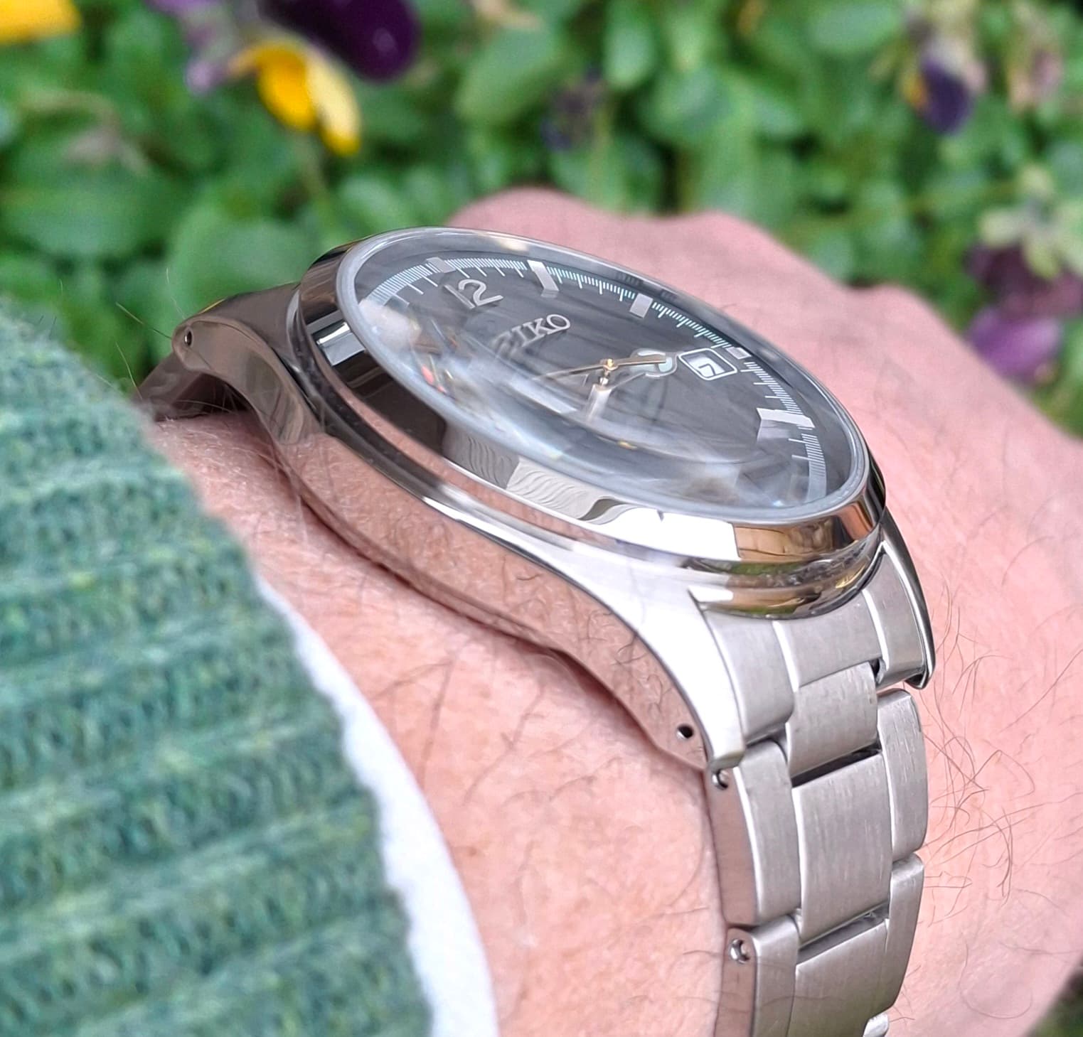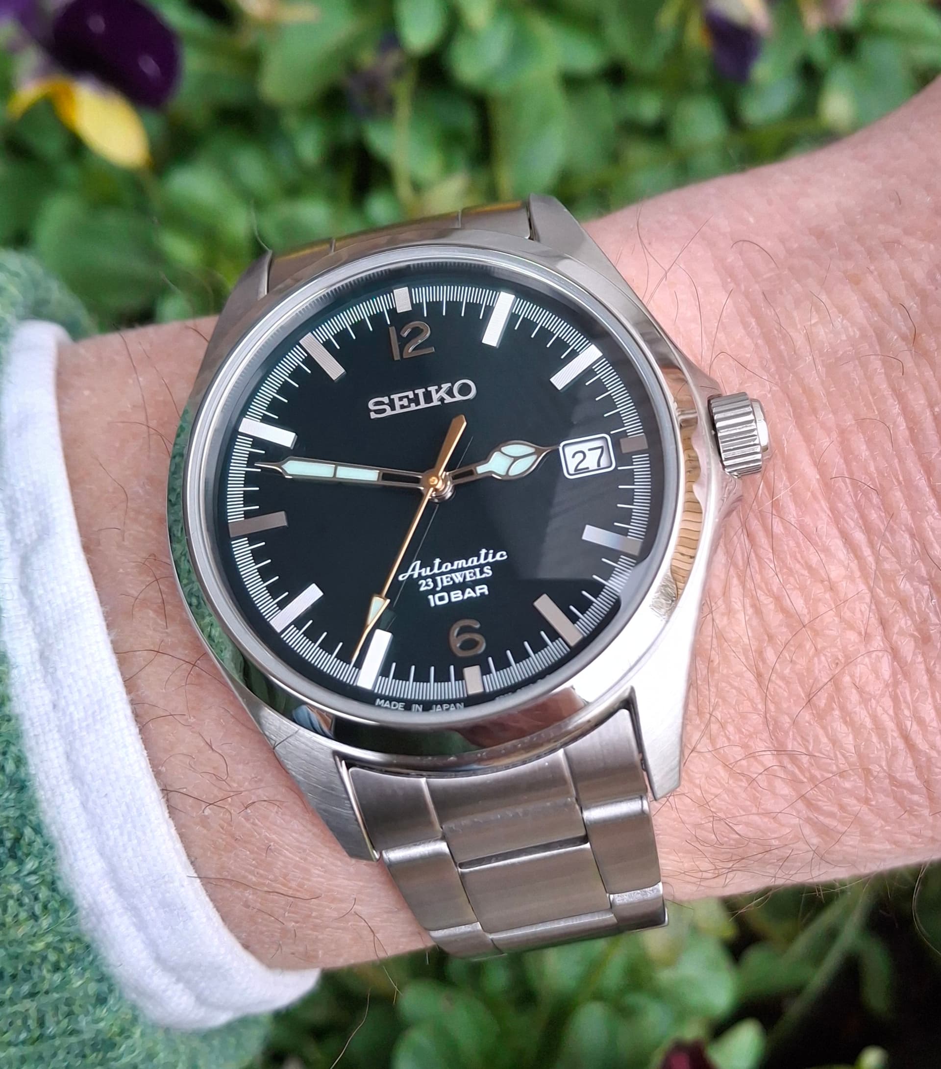 Vandaag was het de beurt aan een onvoorziene gast, als alternatief voor de Seiko Alpinist waarvan ik er twee heb gehad, allebei heb doorverkocht (en ook de nieuwe had het wat mij betreft nèt niet) wederom uit Japan, de Seiko Tictac, met Alpinist vibes zonder het te zijn, in meerdere opzichten. Met 40mm niet klein, voor mij echt inmiddels de grens qua diameter. Vanwege de vrij smalle luntette oogt het horloge ook nog wel iets groter. De kleur van de wijzerplaat is echt héél apart en moeilijk op foto’s te vangen. British Racing Green komt nog het beste in de buurt. Band is okay, maar niet spectaculair, het horloge moet het echt van de wijzerplaat hebben. Ik denk dat hij op bruin leer erg goed uitkomt. Maat is gelukkig 20mm (maar inmiddels heb ik ook genoeg 19mm, dus ook dat had wel gekund).
