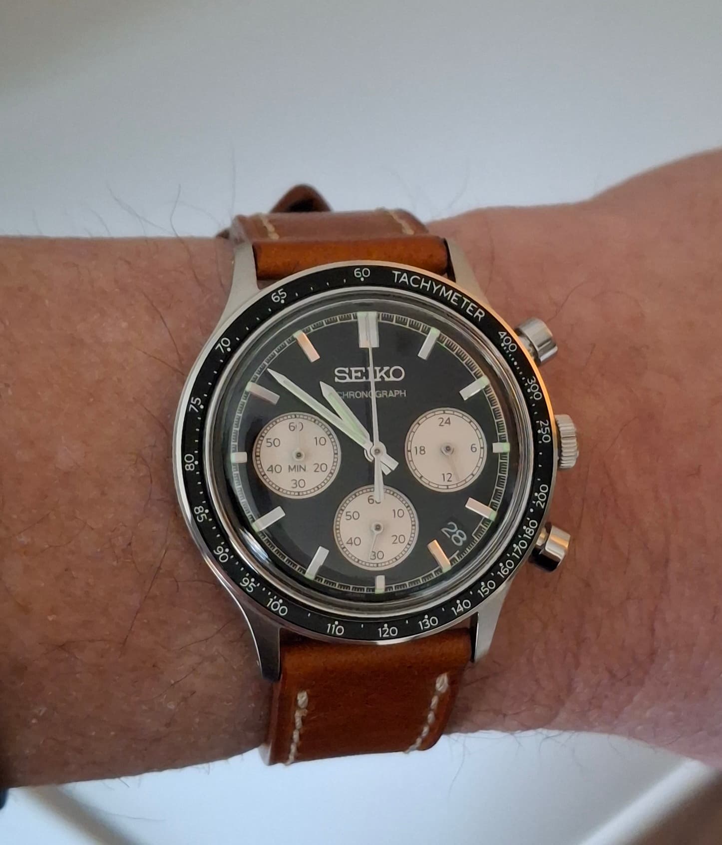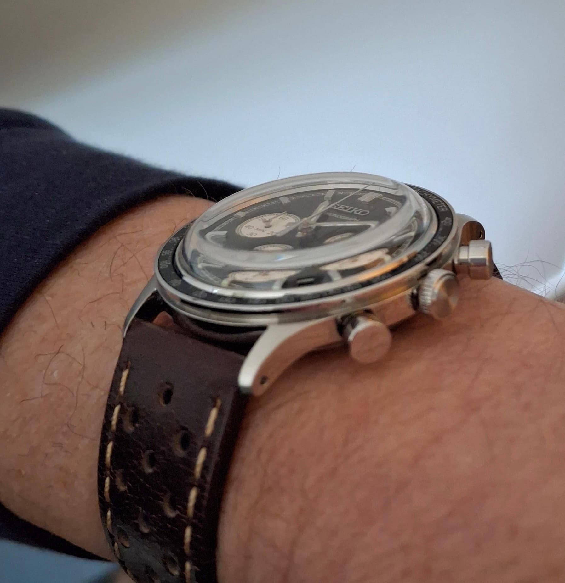 Maar nu: de Seiko chrono. De Speedtimer háált het niet bij dit ding, wat een geweldig uiterlijk, en wat een bandenslet is dat zeg!
