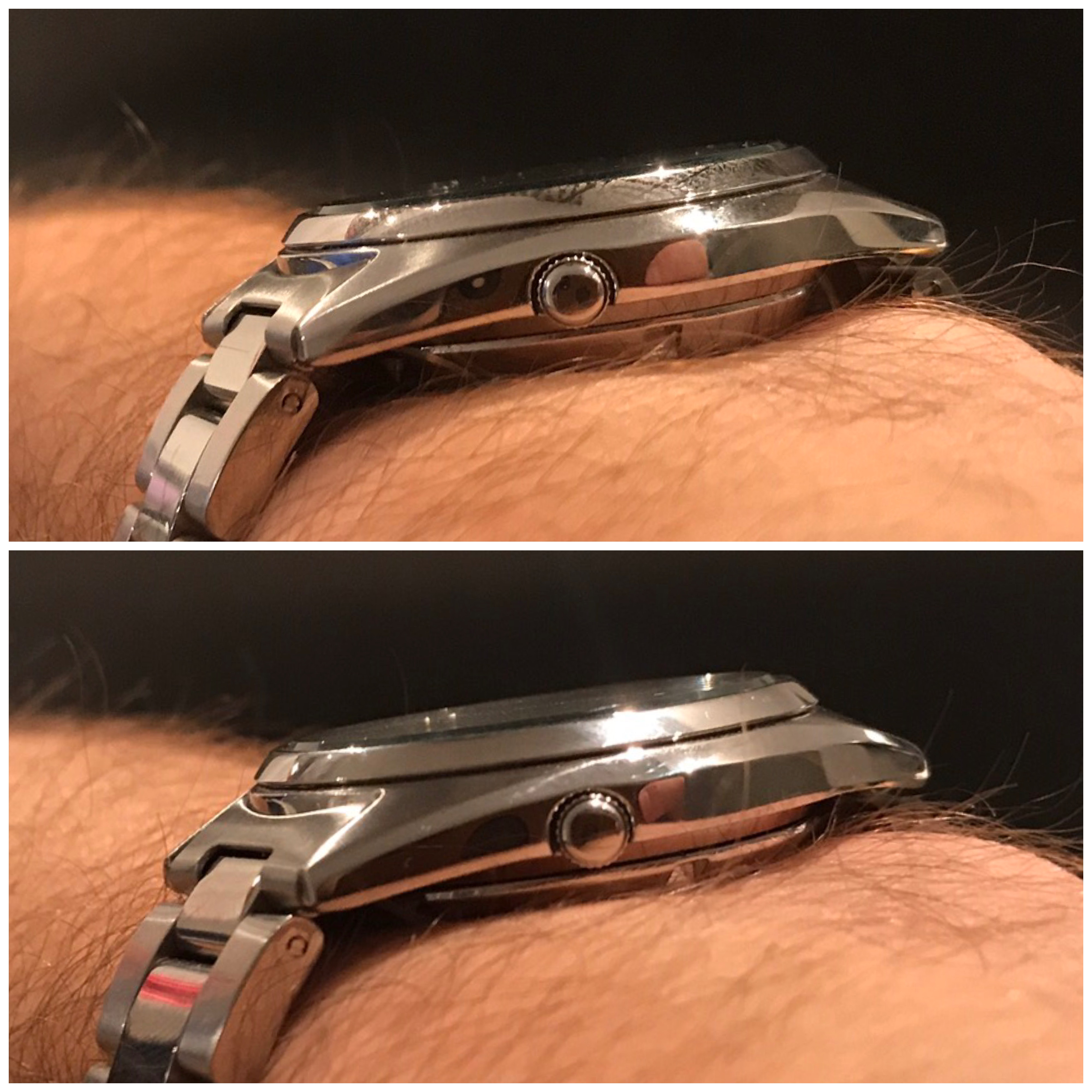 Het is misschien een kleinigheid maar… de glazen casebacks zijn hoger dan strikt noodzakelijk met een stalen caseback.