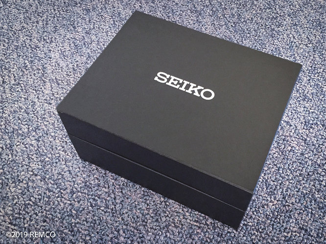 Onder het cadeaupapier, in een standaard witte buitendoos, een keurige zwarte horlogedoos die aan de binnenzijde van het deksel voorzien is van kleurrijk marketinggeweld iz. Prospex en PADI. Net even anders dan de standaard doosjes van Seiko, doen ze leuk.