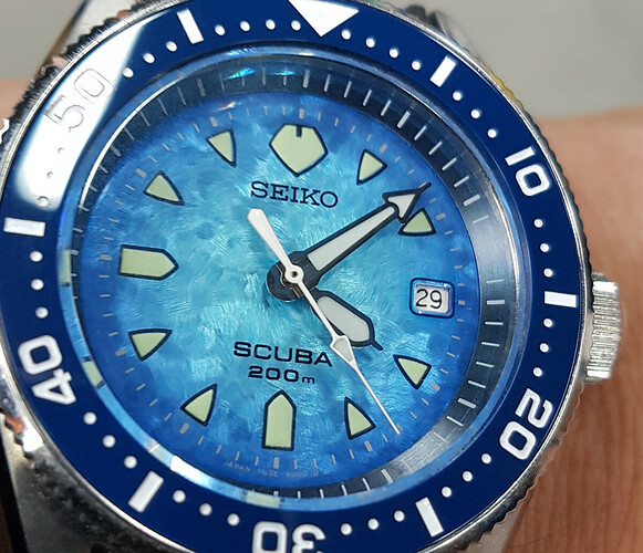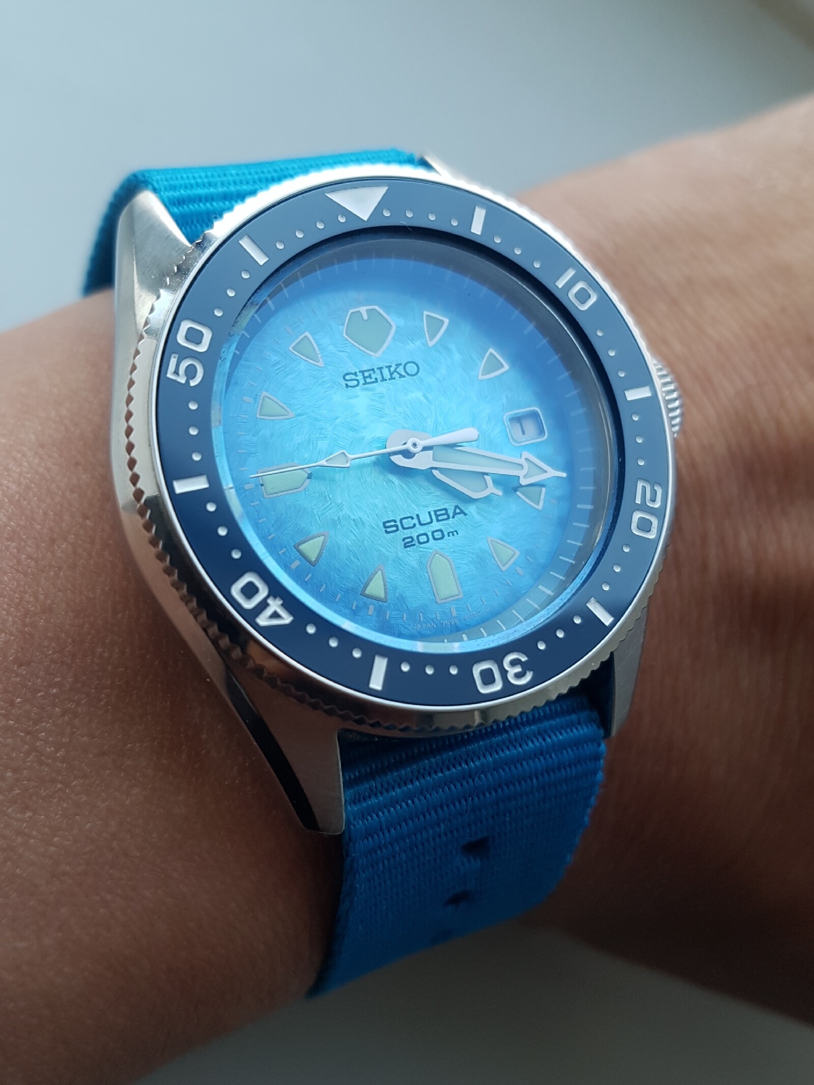 De datumschijf heb ik aan moeten passen omdat het venster niet precies uitlijnt met de NH35 uurwerk die er in zit. Omdat kwaliteits aftermarket onderdelen van een SKX013 moeilijk te vinden zijn heb ik een hele tijd moeten zoeken voor een juiste blauwe ceramic bezel insert. Het enige wat origineel SKX013 is dat zijn de wijzers. Deze matchen perfect bij de randen van de minuten markeringen die dezelfde zilvergouden kleur hebben. Ook mooi is dat je de binnenste seconden markeringen terug ziet op de rand van het blauwe AR coating saffierglas als je er recht boven op kijkt. Dit is het resultaat geworden en ben er erg tevreden mee.