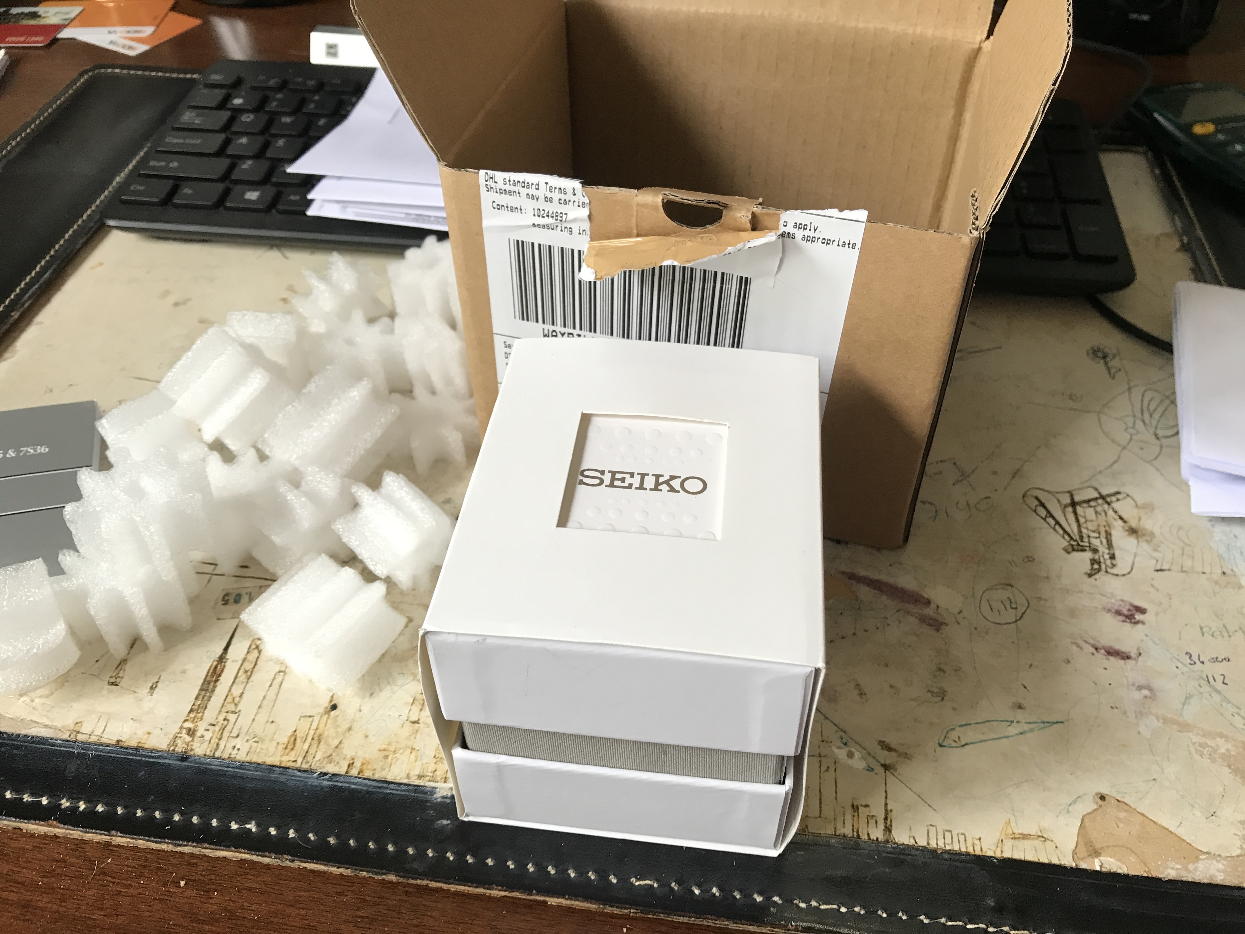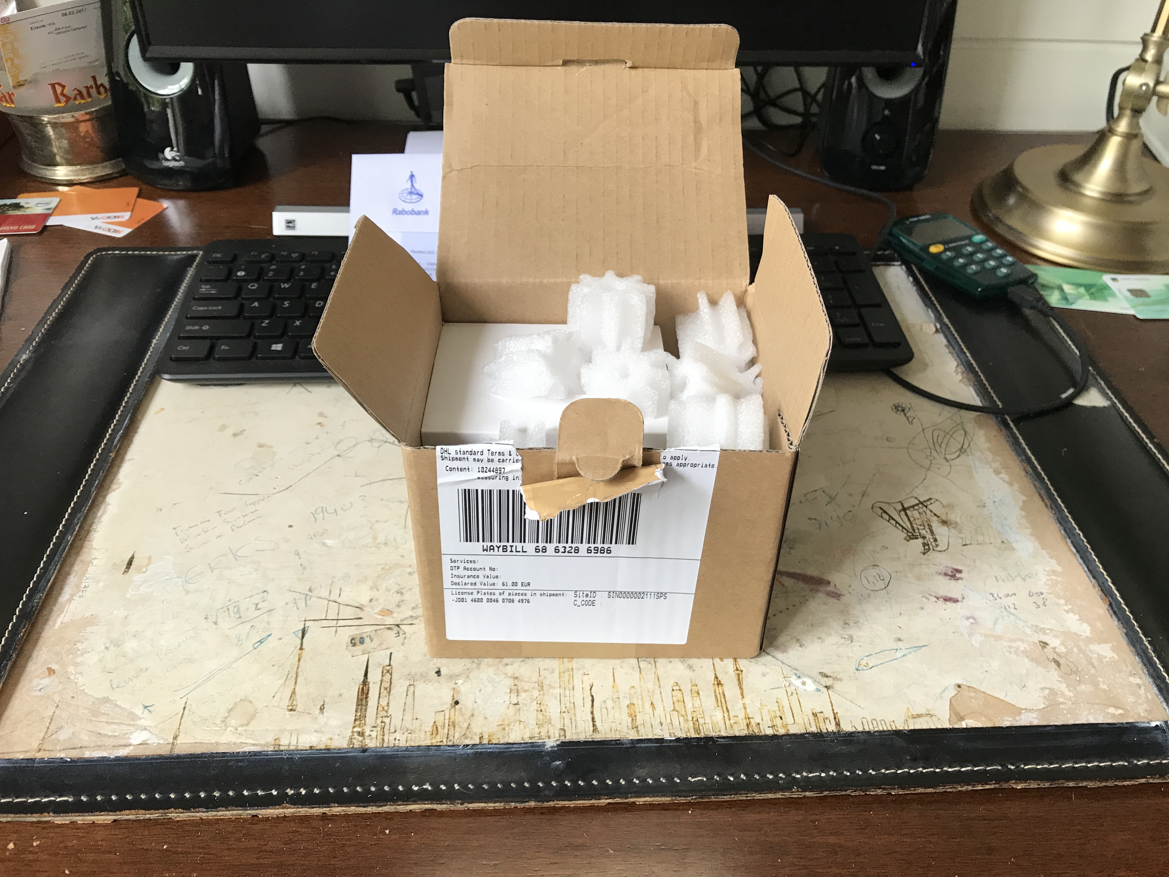 Ook de expresszending was gratis volgens de website, dus die aangevinkt en binnen enkele dagen lag het pakketje op de balie. Graag nog even 32 euro betalen een de lieftallige dame van DHL (helaas sliep de douane dus niet bij mij ) en ik was de eigenaar van een zeer eigenwijs smoelend horloge.