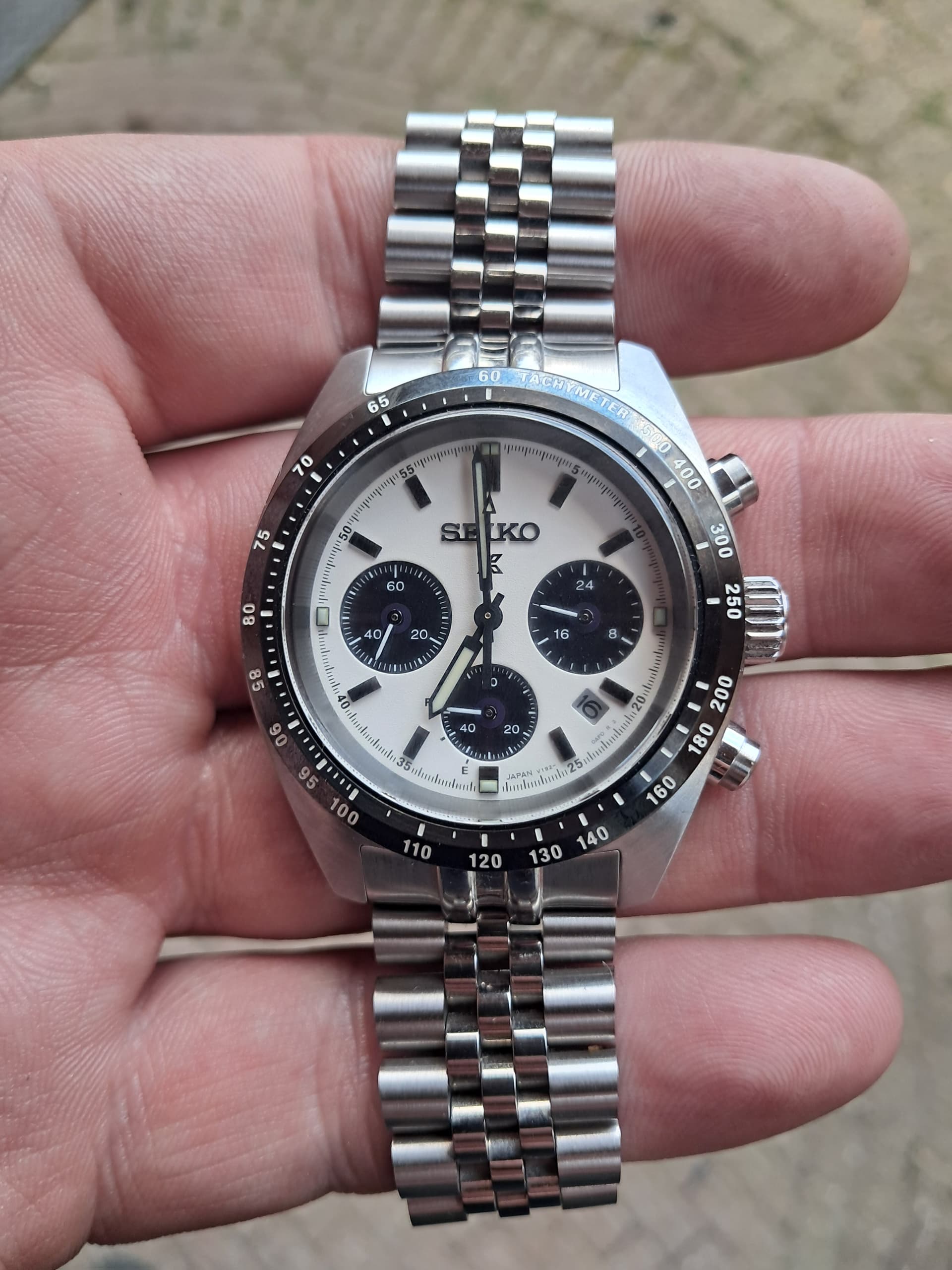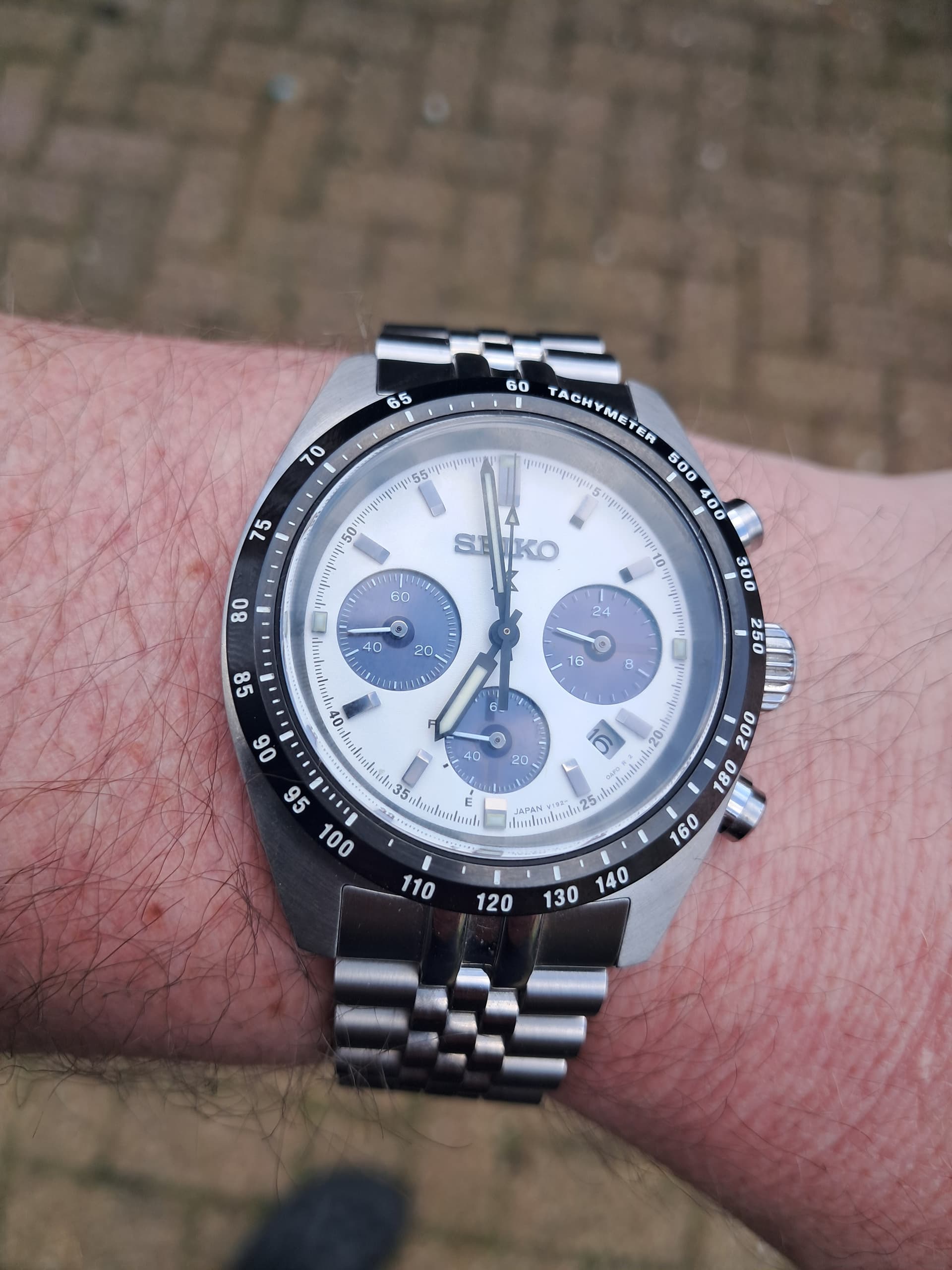 Gekocht via het forum (de 3e al weer, na een Fossil en Tag Heuer), de Seiko Speedtimer SSC813. Ik had enkele redelijk betaalbare horloges op mijn lijstje staan, waaronder de Aquaracer (in december gekocht), de PRX (die komt zaterdag) en een Seiko Speedtimer. De Speedtimer stond het langste op het lijstje, en ik hoopte keer op keer deze tegen te komen in Roermond. Deze past namelijk goed bij de 5 andere Seiko’s die al in de horlogebox aanwezig zijn.