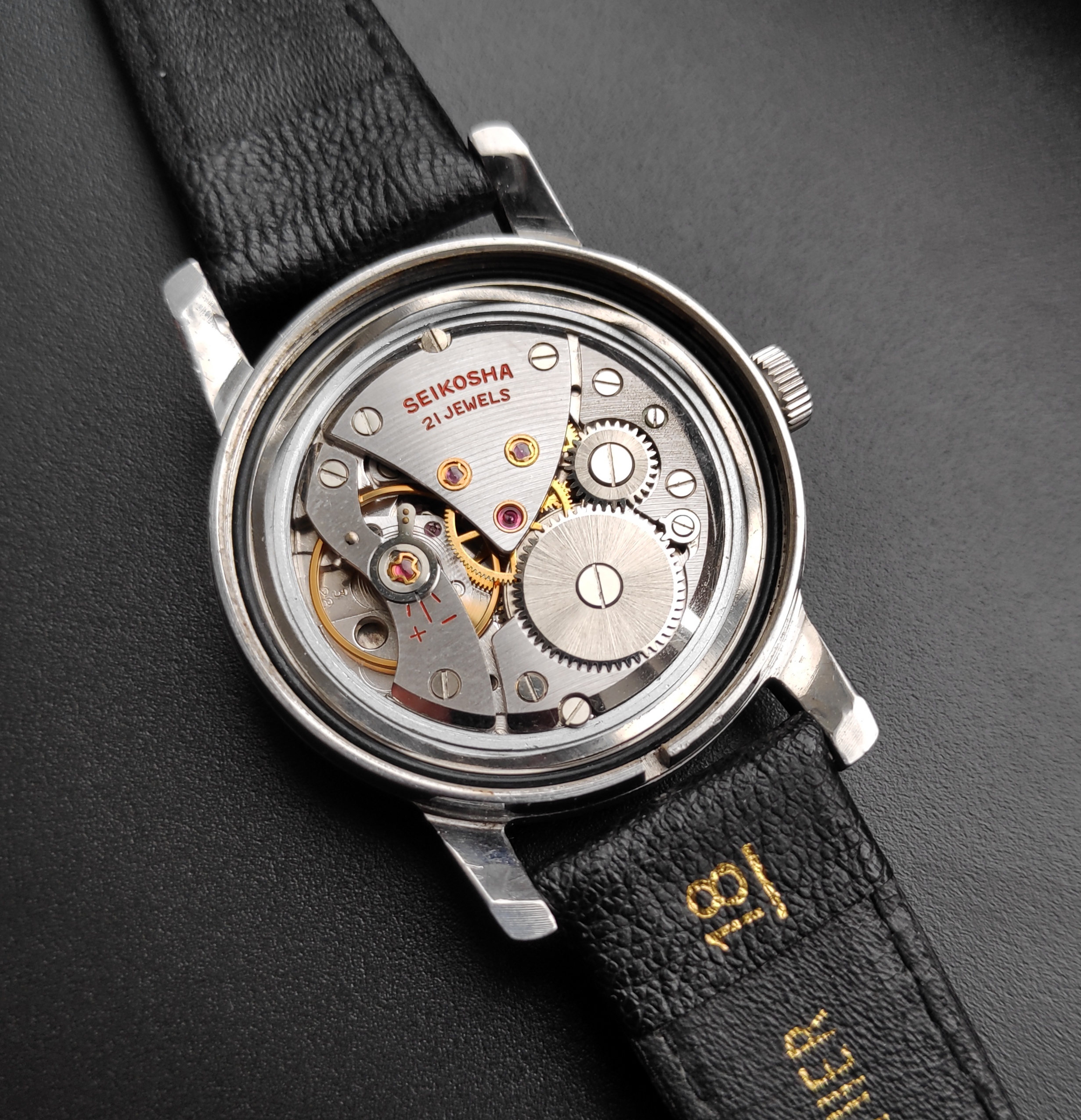 De veer bleek gebroken te zijn toen ik het horloge voor de eerste keer het horloge opwond en de veer voelde slippen. Gelukkig heeft @Aad57 mij kunnen helpen door het horloge te servicen en een nieuwe veer en glas te vinden waarvoor dank (wat bij dit soort oude en obscure modellen veel lastiger is dan normaal). Binnen in zit een mooi handwinder uurwerk en zien we het Daini DNA terug. Aan het uurwerk en het ontwerp daar van is te zien dat de Cronos de voorlopers was van de King Seiko’s.