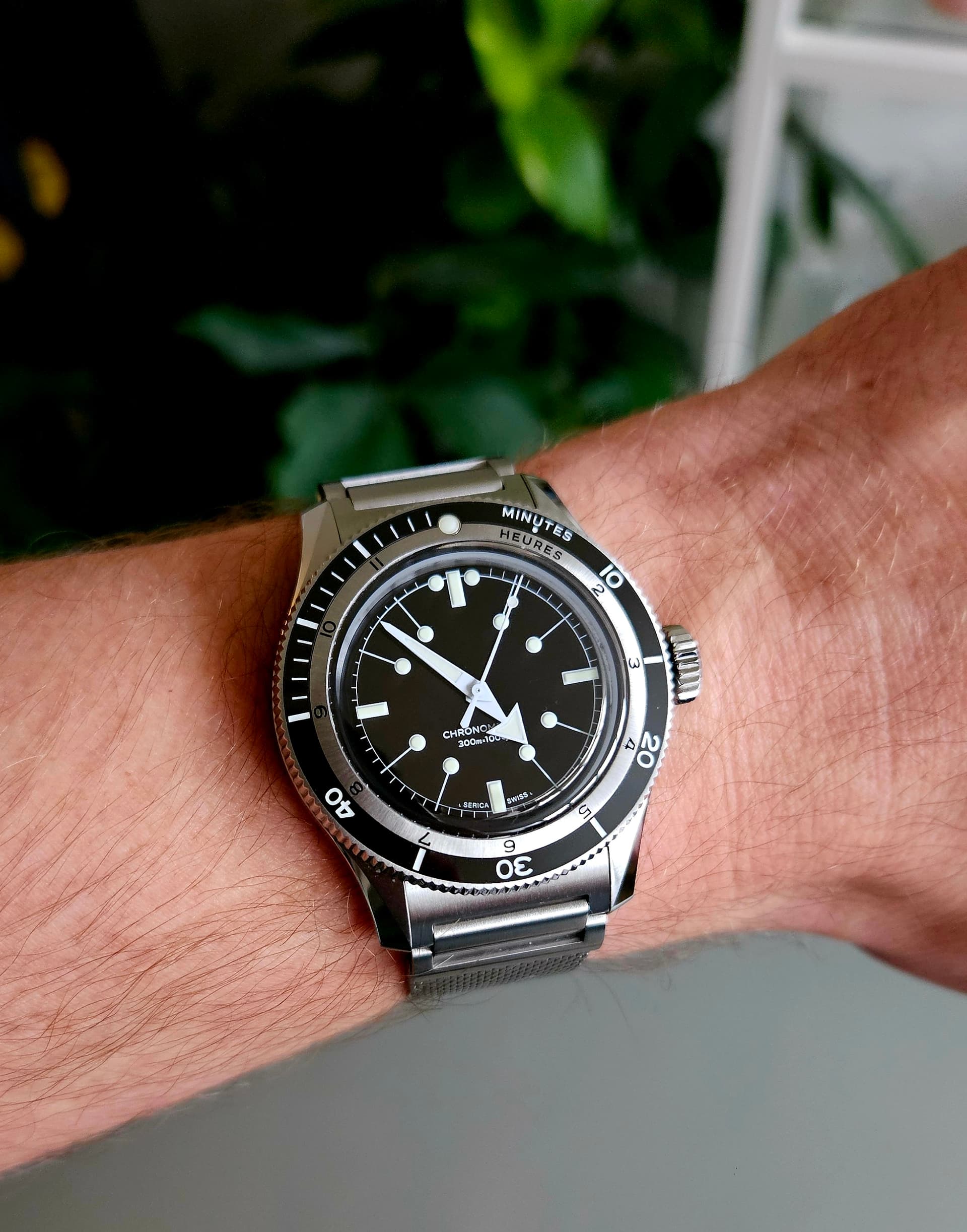 Buiten de marketing onzin vind ik het horloge nog steeds echt heel cool. Een eigen gezicht door de wijzerplaat, een broad arrow wijzer (geen fan van speedmasters, maar met kan ik ze wel waarderen), gebruik van een mooi kleurtje op de bezel en inclusief een mooie groene MN stijl bandje. En hij draagt op de milanese band erg goed. Nou alweer lang genoeg geluld tijd voor foto’s.