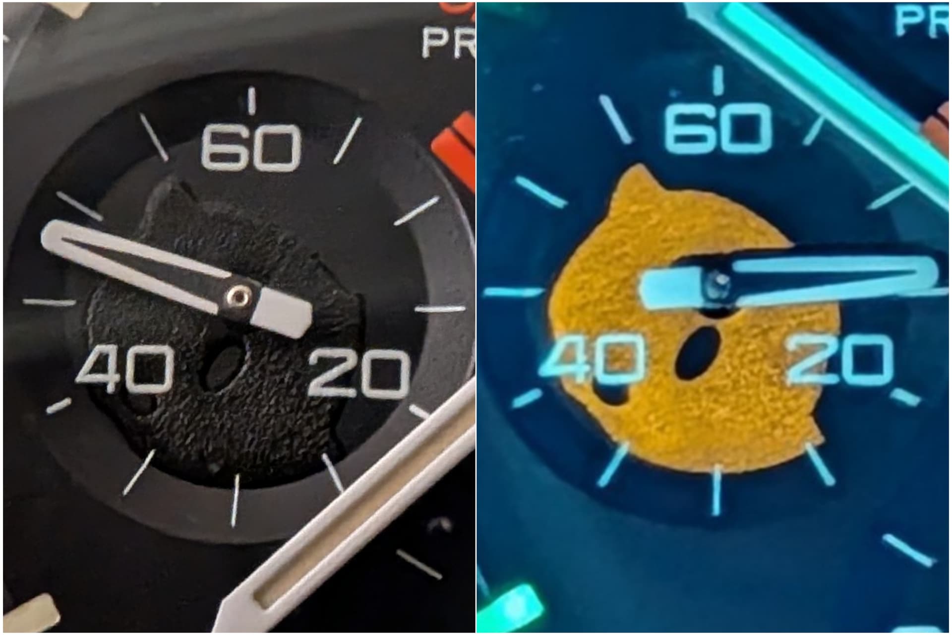 Bedankt, gaat zeker lukken. Die vlek is het silhouette van de hoofd van Ultraman. Die licht Oranje op, maar alleen als je er met een UV lamp op schijnt. Anders is het gewoon een vlek op de linker dial.
