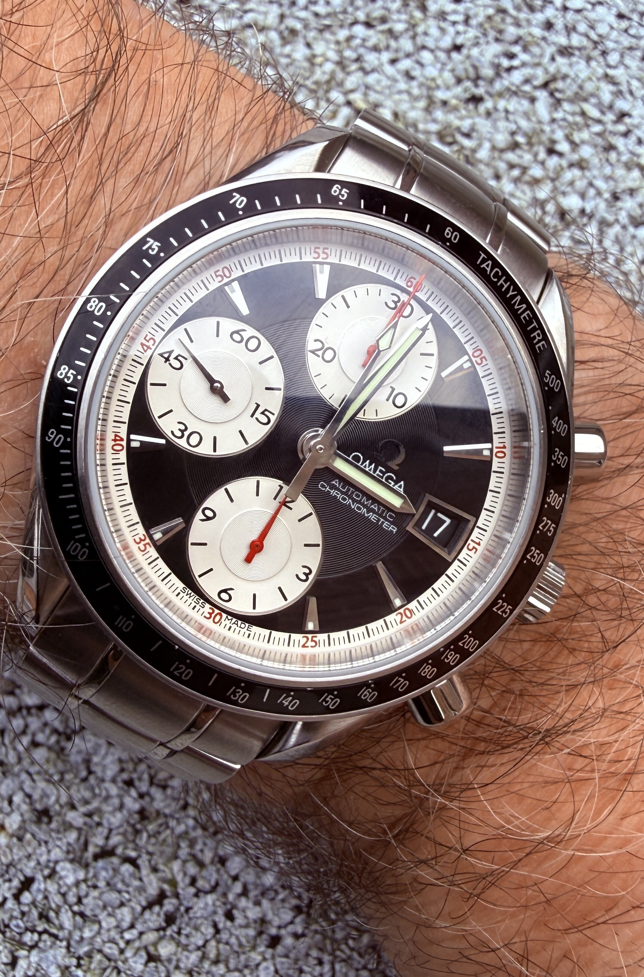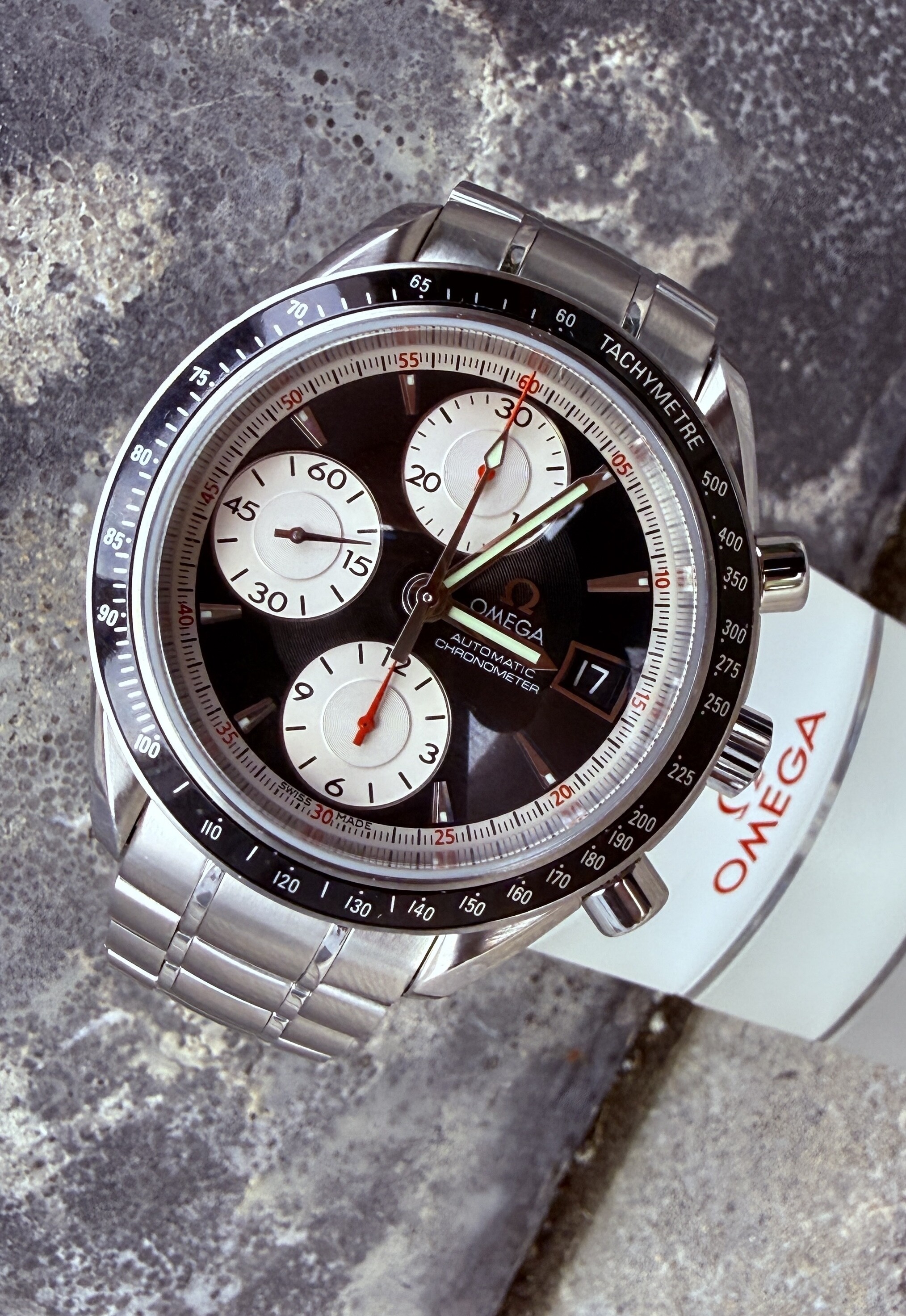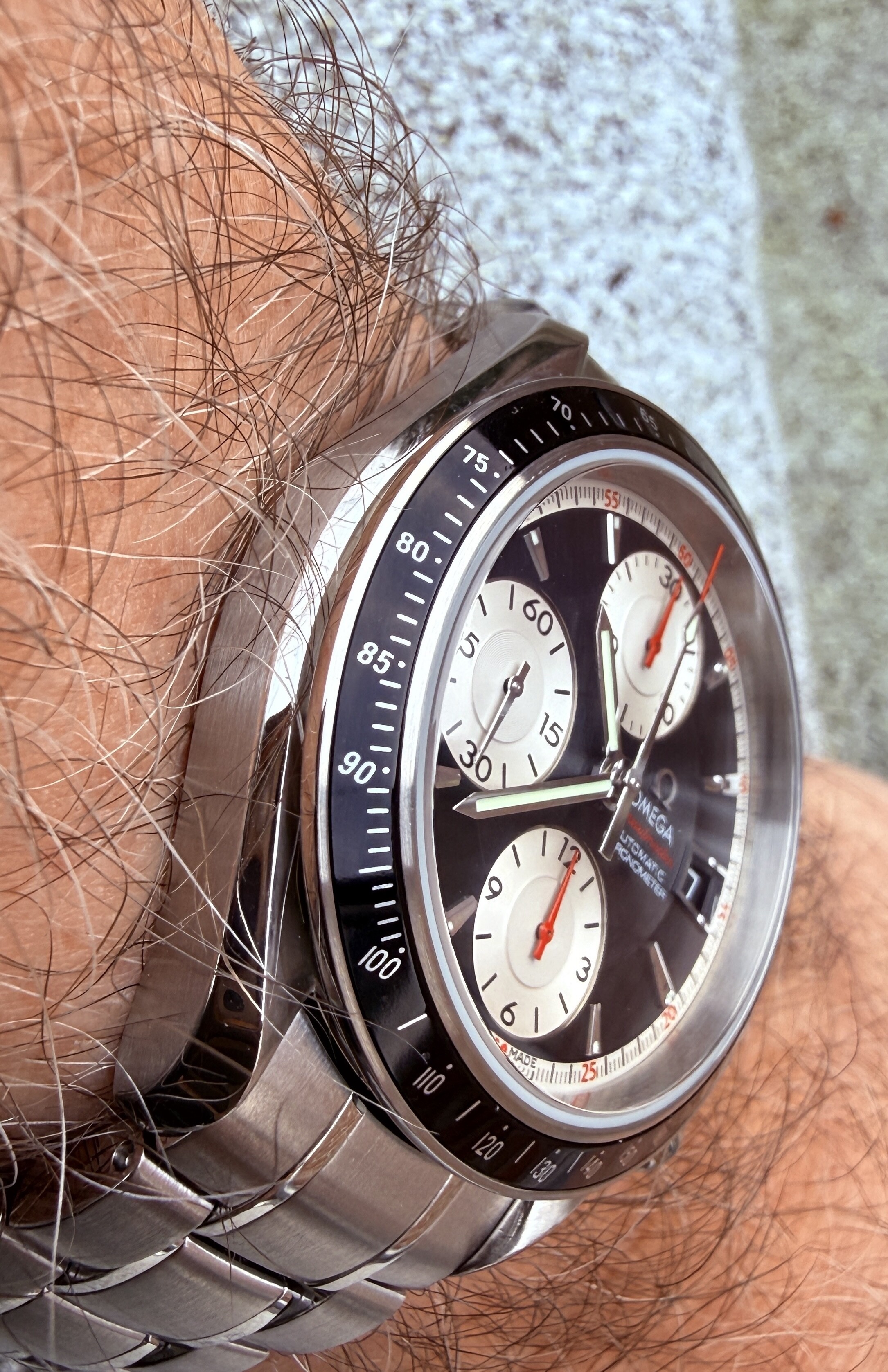 Een paar weken geleden mocht ik een Speedmaster automatic panda aan mijn verzameling toevoegen. Mijn eerste NA in jaren. Het verlangen is (weer) aangewakkerd en er bleek nog wat ruimte te zijn aan het eind dit jaar: Mijn oog viel op eenzelfde Speedmaster met zwarte dial. Bouwjaar 2000, 40mm, ref 3210.51.00, kaliber 1164. Ze vormen een mooi twee-eeiig setje. Nu maar zorgen dat ze beiden evenveel aandacht krijgen ![]()