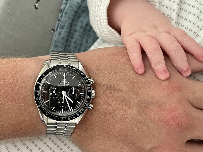 En die dag kwam vorige maand! Ter gelegenheid van de geboorte van mijn zoontje heb ik een nieuwe Speedmaster sapphire sandwich aangeschaft. Ik wilde het horloge eigenlijk pas kopen na de geboorte, maar er zat vorige maand bij een bekende AD op Schiphol zo’n fijne korting op, dat ik ‘m toen alvast heb meegenomen. Dan maar een maandje in de doos laten liggen tot de kleine er is, al was dat niet gemakkelijk.
