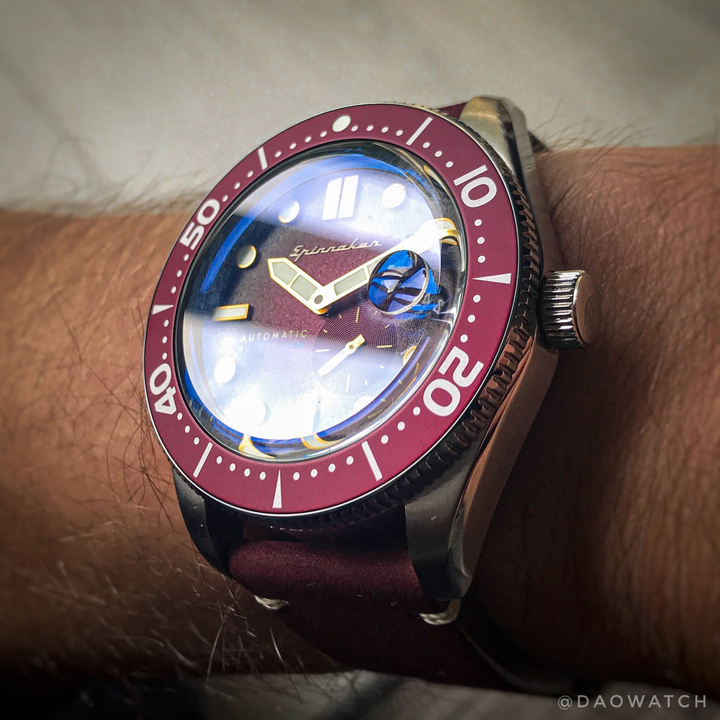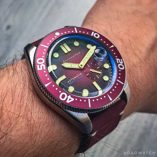 Het horloge is een Spinnaker Croft, en hoewel ze veel kleuren hebben die meer mensen zouden aanspreken dacht ik ach, als ik 'm dan toch gratis krijg, laat ik dan ook eens echt iets anders kiezen dan de kleuren die ik toch al heb. Het heeft een Miyota 8218 automatisch uurwerk met hand winding, geen hacking. Wat ik ervan heb gelezen, prima uurwerken met een wat lagere beat rate, maar wat je niet terug ziet omdat de secondenwijzer klein is en die daardoor volledig vloeiend oogt. De kleine secondenwijzer op ‘half 5’ is de reden dat ze voor dit uurwerk kozen.