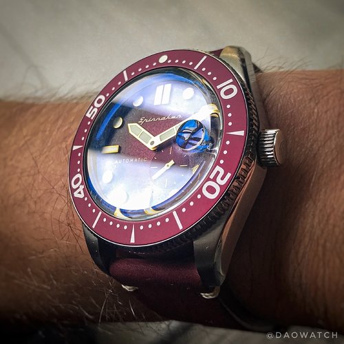 Het gebolde saffier lijkt op de top hat van Crystaltimes, door de distortion en sterke bolling aan de zijkanten van het glas, maar komt eigenlijk niet zo ver boven de bezel uit. Verder is de bovenkant vlak, wat maakt dat de blauwe AR vrijwel alleen in de bolling aan de zijkant zichtbaar is, en voor het eerst iets toevoegt ipv me in de weg zit. De grape / paarse / bordeaux kleur matcht goed met de blauwe glans. De datum loep… tja ik weet niet. Dat hij erop zit is prima, ik ben daar niet op tegen en soms vind ik het zelf wel mooi, hij vergroot sterk (ik denk 2,5x) en dat is beter dan in de meeste gevallen, maar het beeld is wel wat vervormd. Gewoon als je er recht inkijkt. Misschien niet perfect geslepen, ik weet het niet, de datum is groot maar ziet er wat vreemd uit, niet altijd goed leesbaar.