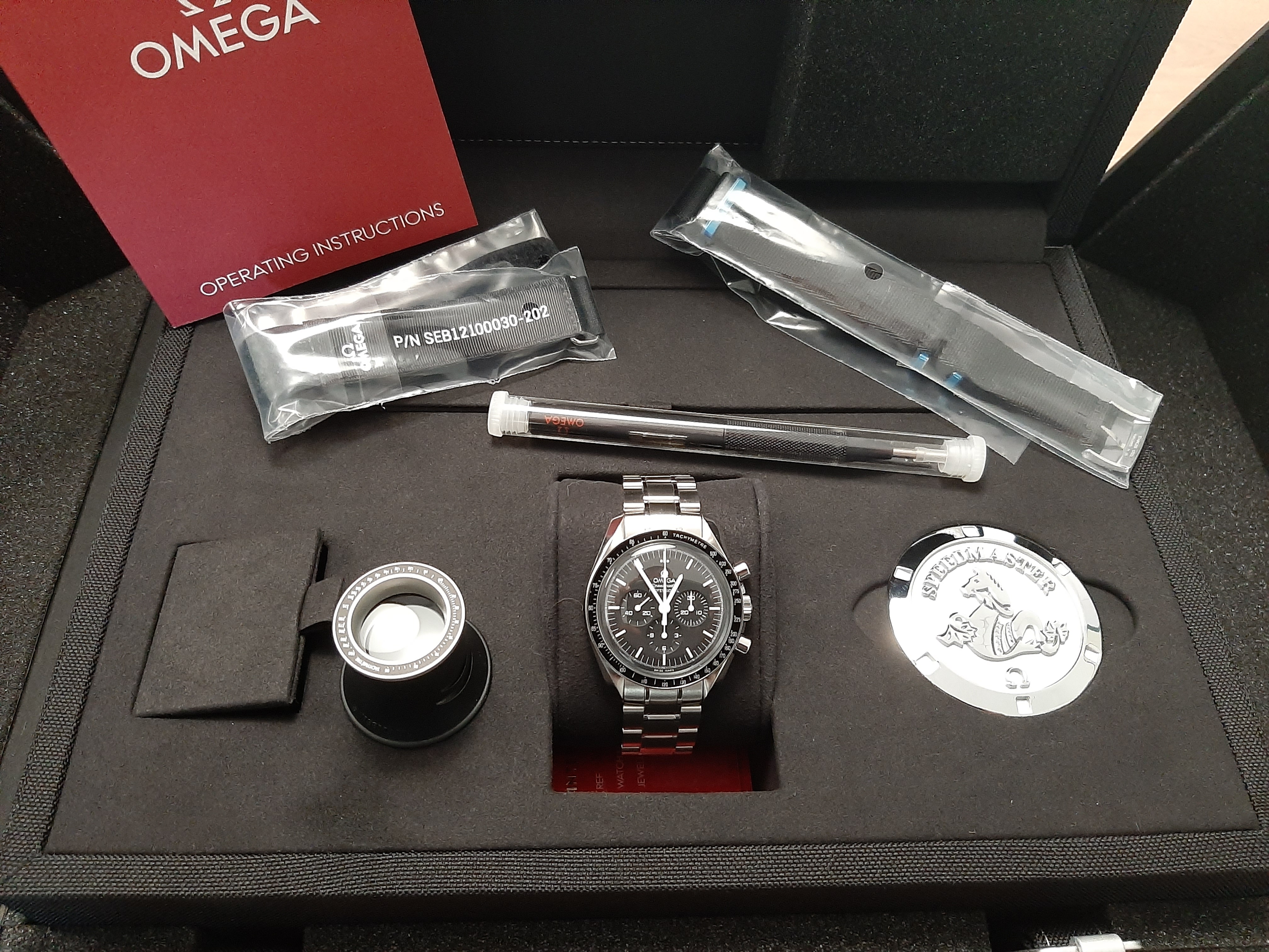 In het midden pronkt de Speedmaster en daarnaast de medaillon met in de verborgen luikjes een loep, nato en banden aanzetter.
