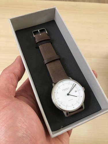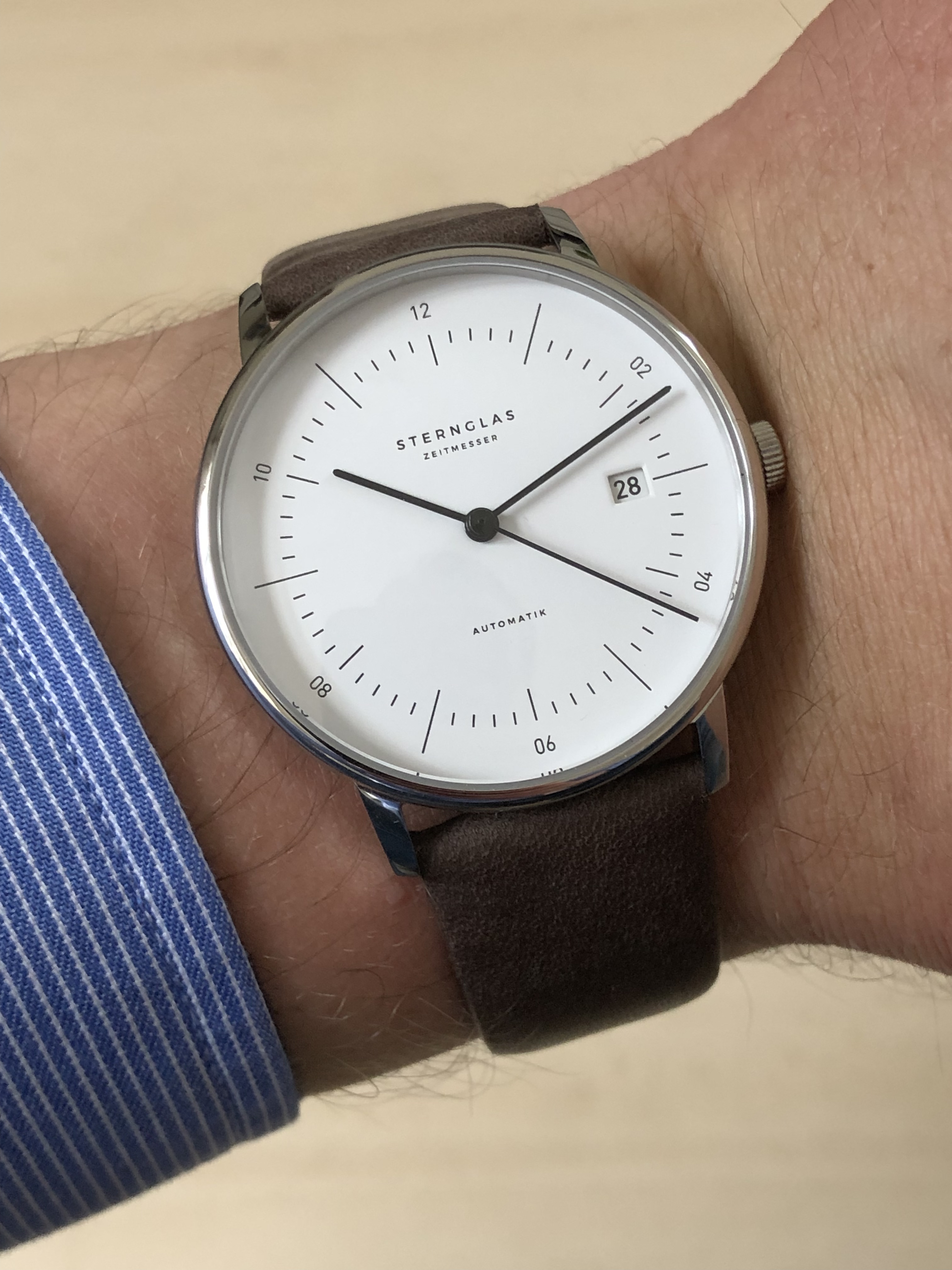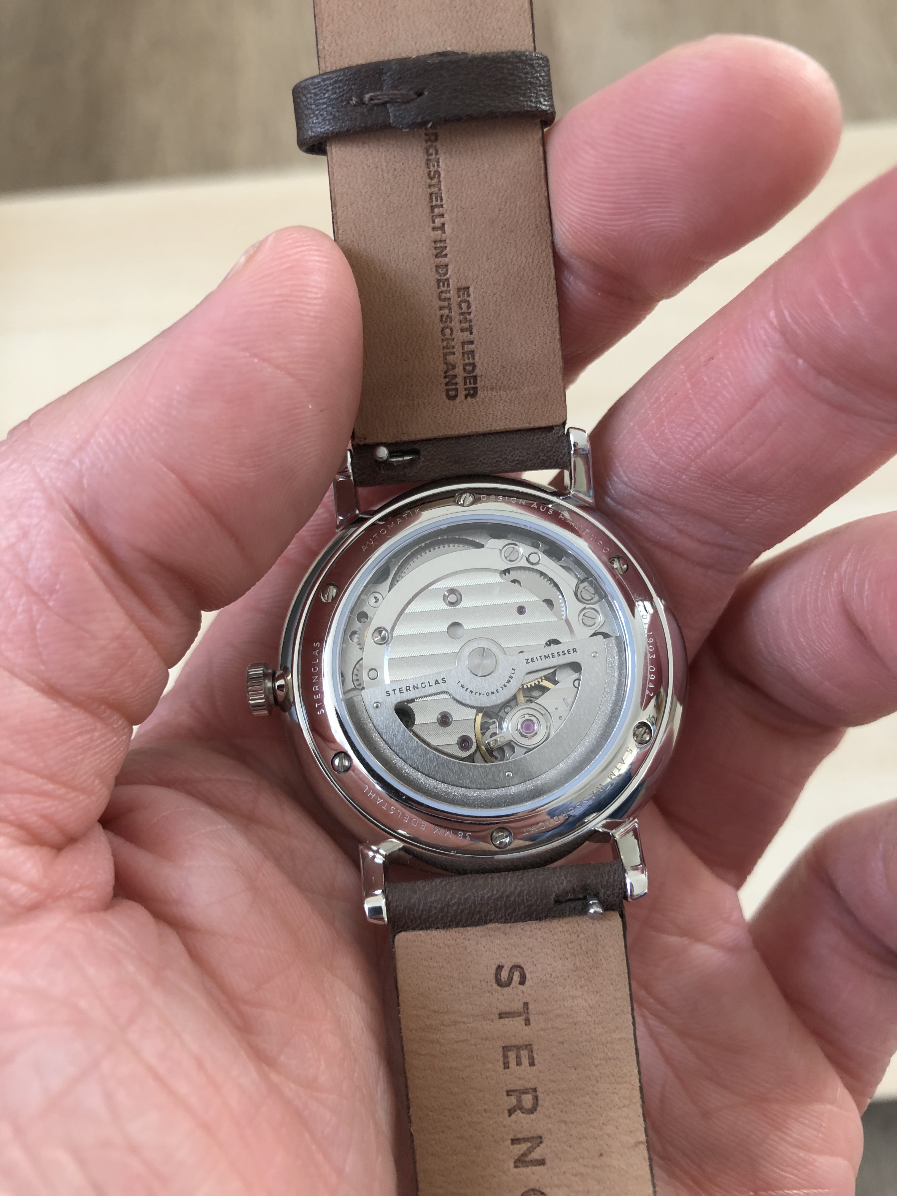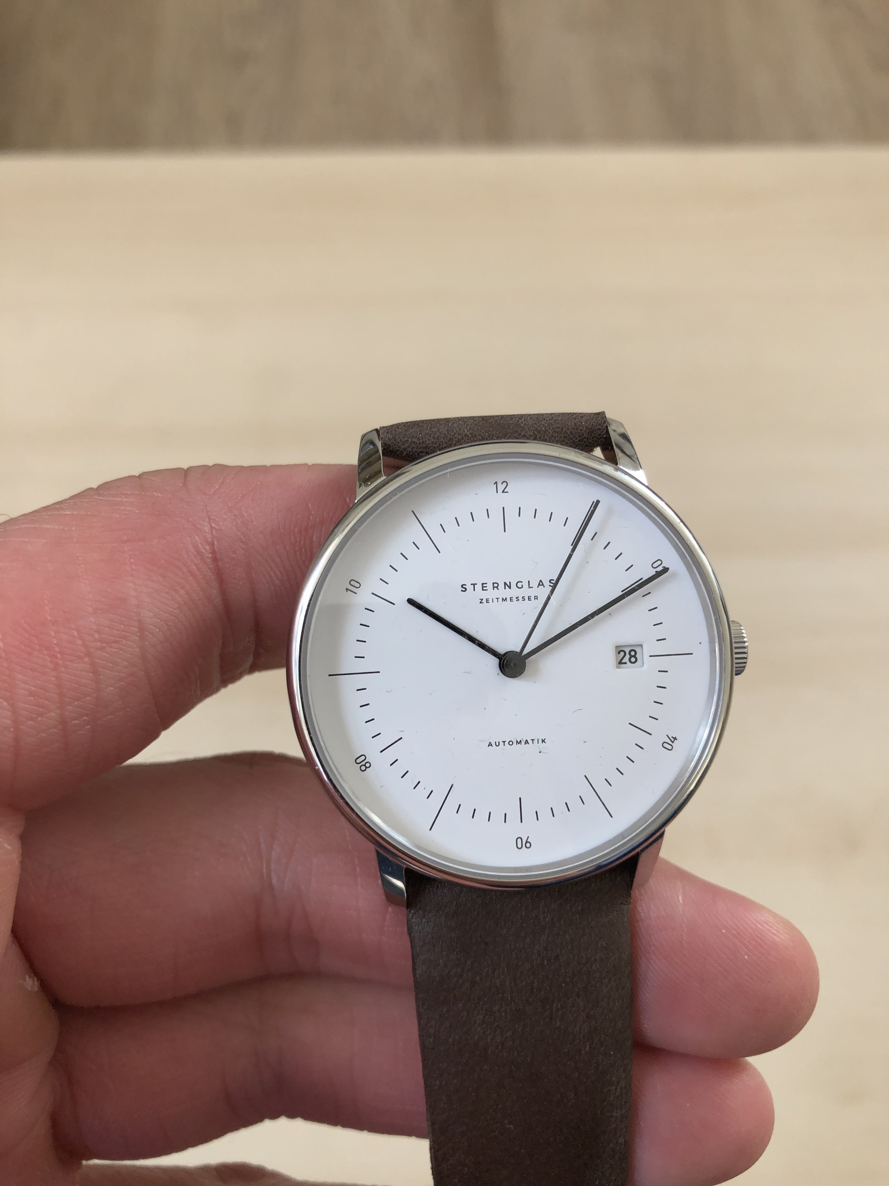 Vandaag is er een nieuwe aanwinst binnengekomen. De Sternglas Naos Automatik uit Hamburg, Duitsland. Minimalistisch Bauhaus design in een 38mm case op een bruin lederen band. Zowel aan de voorzijde als achterzijde saffier glas en een display caseback die het MIYOTA 821A automatisch uurwerk laat zien. Dit horloge is mijn eerste collaboration op mijn horloge Instagram ‘The Watch Brigade’, je weet wel van de ‘ontwerp het logo HF-CHALLENGE’.