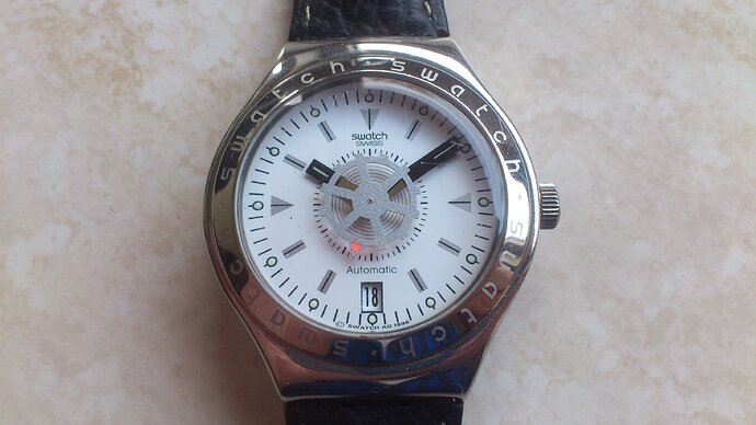Mijn eerste Swatch en mijn eerste ETA uurwerk, hier op het forum al ontdekt dat er een ETA 2842 in zit. Het horloge heeft een stalen kast (vind de plastic modellen maar niks) en voelt degelijk aan.