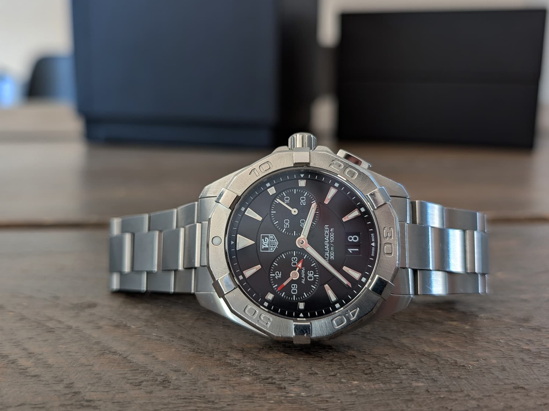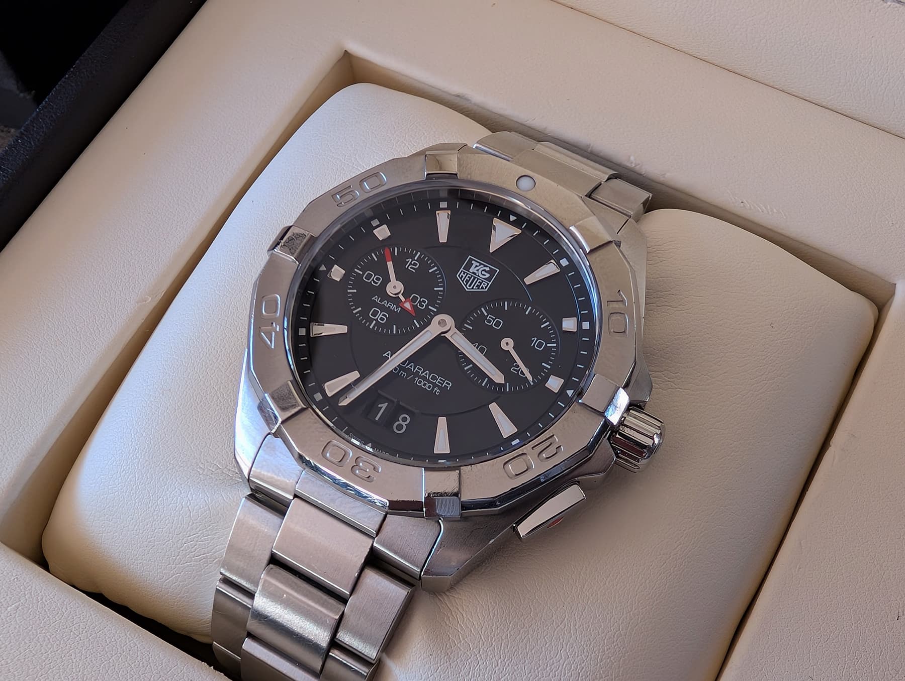 Vanaf het moment dat de grijze niet doorging wist ik dus al wel vrij zeker dat ik voor de Aquaracer Alarm - WAY111Z zou gaan. Nu nog een geschikt exemplaar vinden. Bij B&O Watches stond een exemplaar te koop, alleen die had geen doos en papieren. Gelukkig vond ik er al snel een bij een particulier, met doos en papieren.