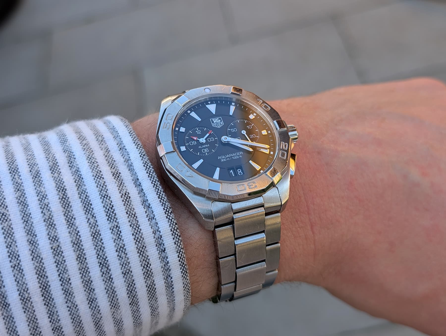 Tussendoor liet ik de Quartz-wens toch een beetje varen en dat kwam door een Aquaracer WAY2113.BA0910 die ik tegenkwam. Met een prachtige gestreepte grijze dial, binnen budget en binnen de andere gestelde criteria. Het enige waar ik een klein beetje over twijfelde was het datumvenster. Ik wist niet of ik die mooi vond of niet, te opvallend of nog net oké. Die twijfel duurde iets te lang, want juist op het punt dat ik wél wilde gaan kopen, was hij die dag weg.