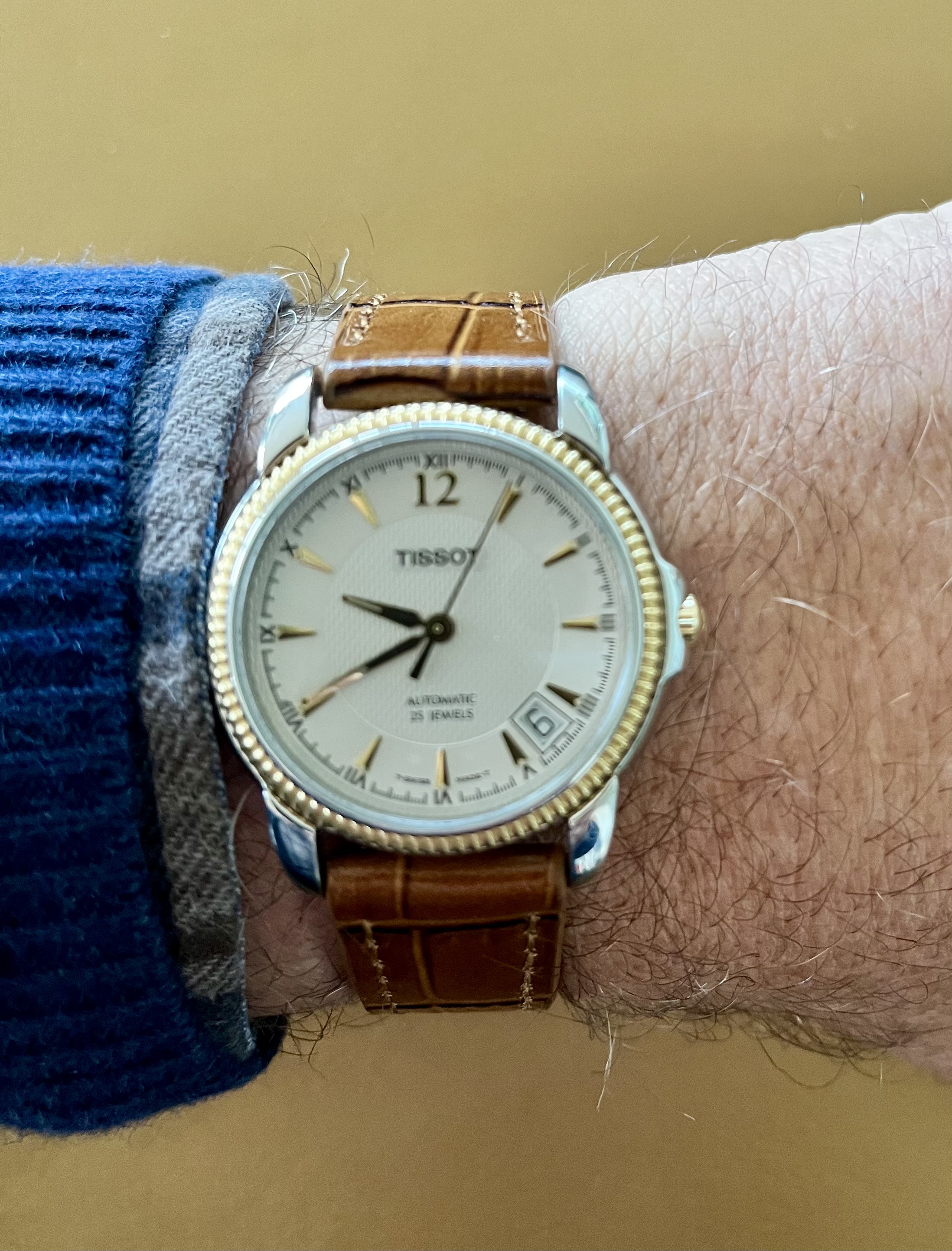 Net mijn Tissot Ballade automaat uit 1999 binnen gekregen. Ik keek al een tijdje naar een Le Locle, maar vind die net iets te groot. Deze is voor mij perfect met 37mm en heeft dezelfde guilloche wijzerplaat. Hij kwam op staal, maar ik geloof dat ik leer chiquer vind. Fijne dag allemaal!