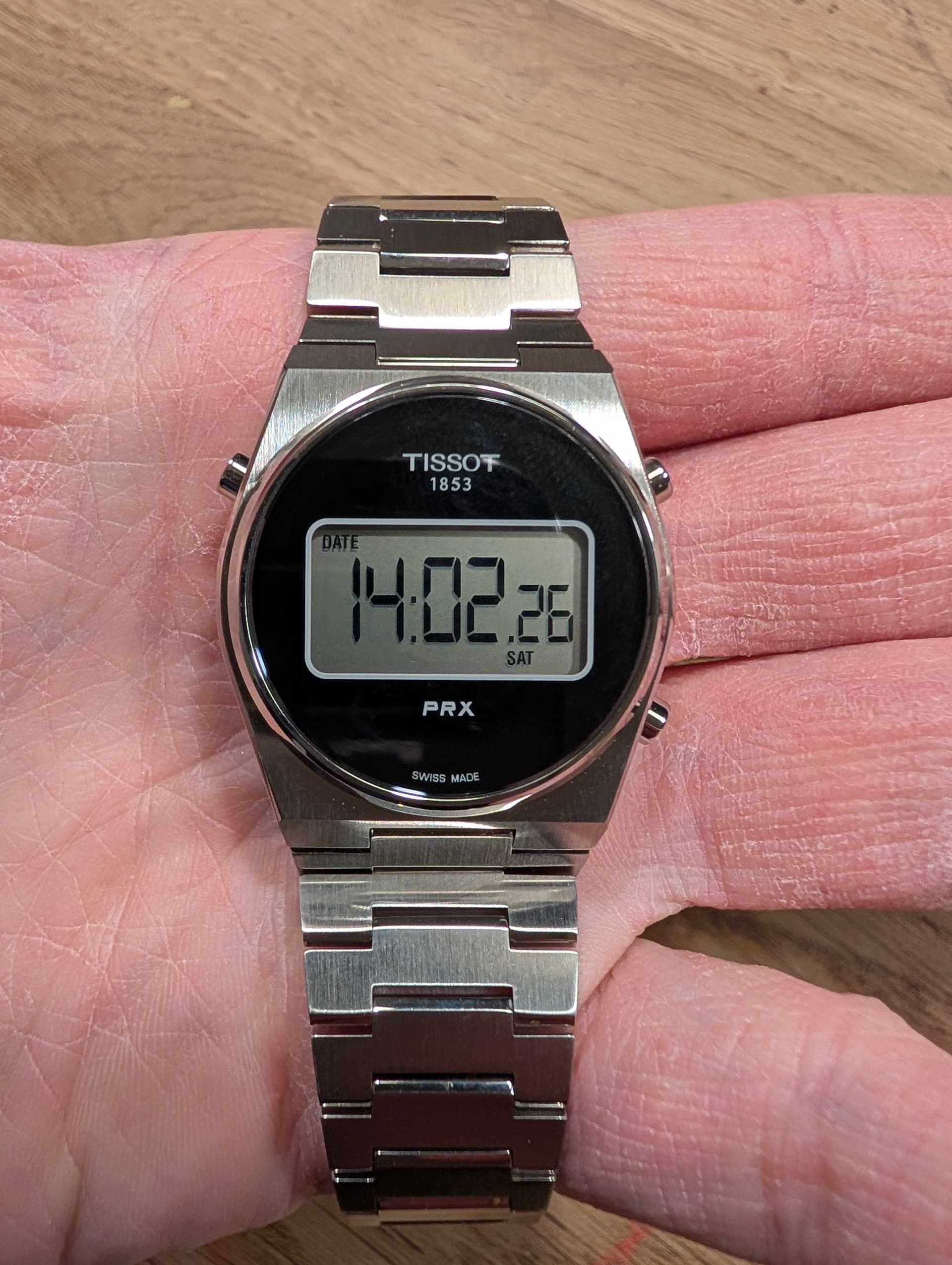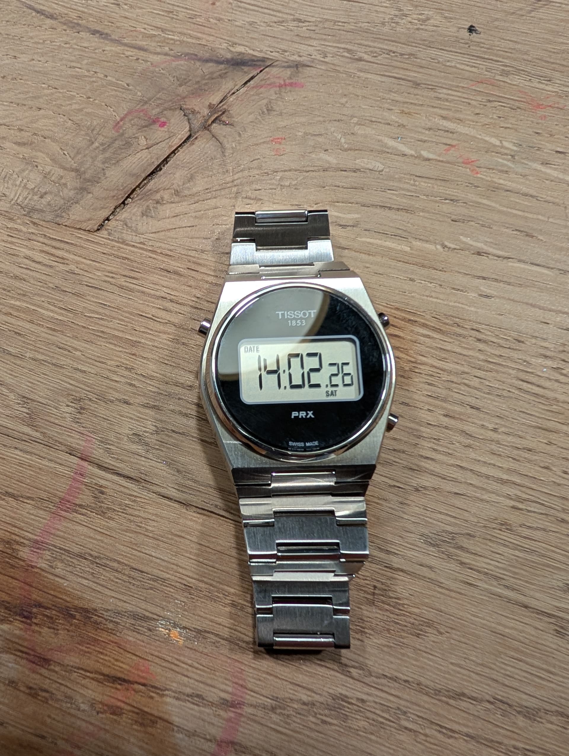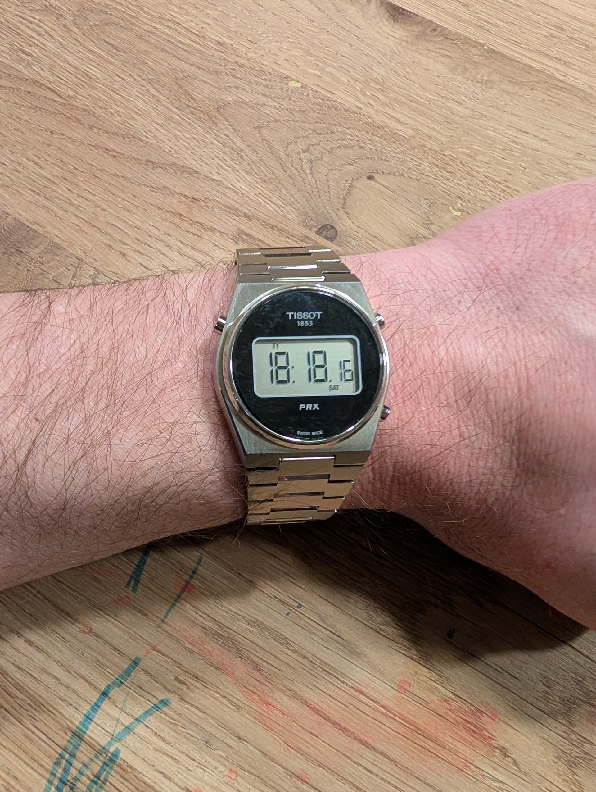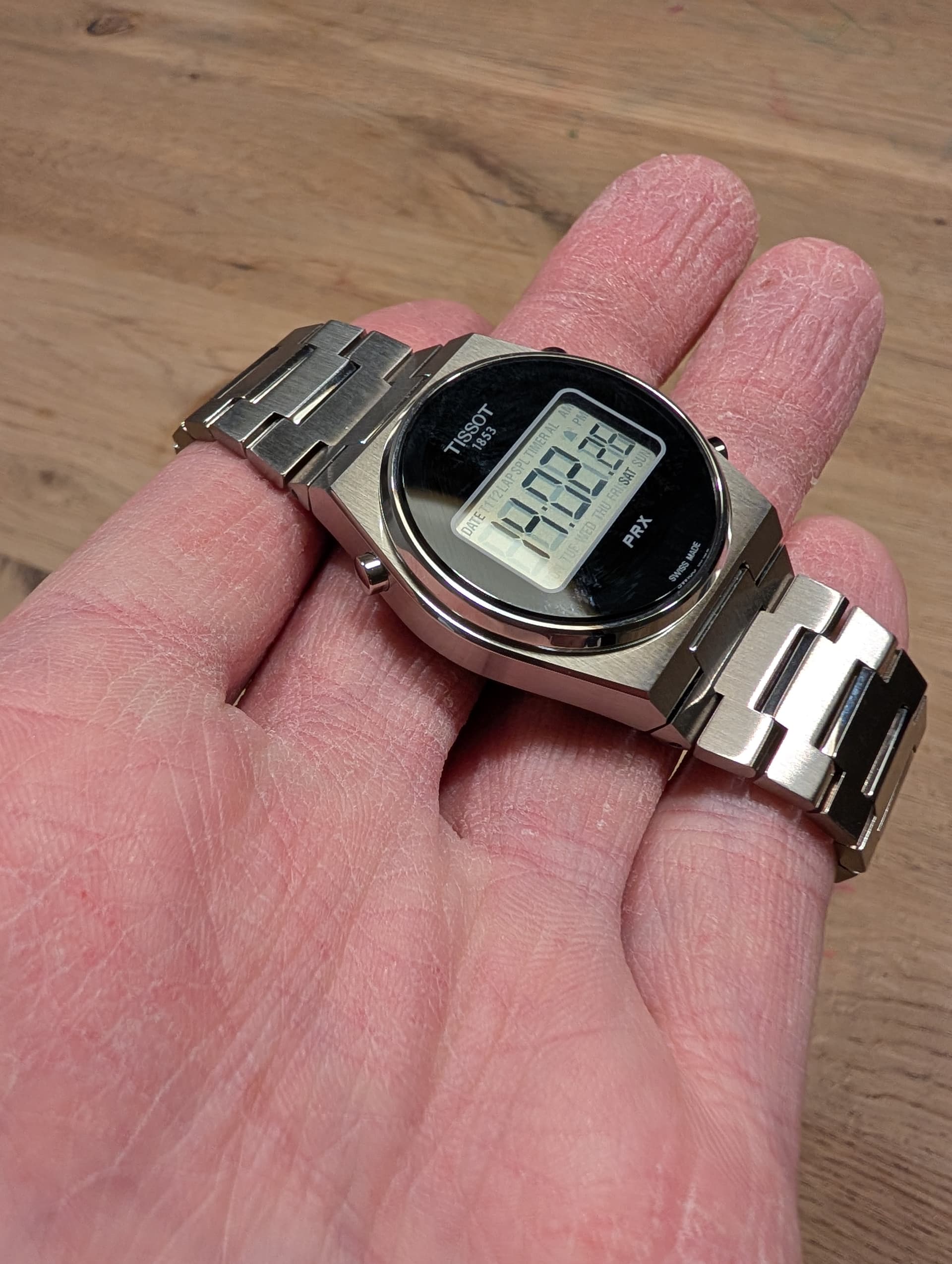 Niet het meest populaire horloge, maar als liefhebber van digitale horloges ben ik er erg tevreden mee, mijn zojuist uit Amerika bezorgde Tissot PRX 35 mm digital. Bewust gekozen voor de kleinere variant om ik deze net wat betere verhoudingen vond hebben dan zijn groter broer van 40 mm. Daarbij heb ik geen reuzenpols en vind ik een horloge, als het geen Casio G-Shock is, al snel te groot. Het horloge heeft saffierglas en een degelijke stalen band (kom daar maar eens om bij een Casio in deze prijs range). Verder de normale digitale opties. Voor omgerekend 185 euro het geld zeker waard (Ok, retailprijs is rond de 300 euro volgens mij). Gekocht bij een grijze dealer, maar keurig met garantiekaartje en in de stickers bezorgd. Hier wat plaatjes: