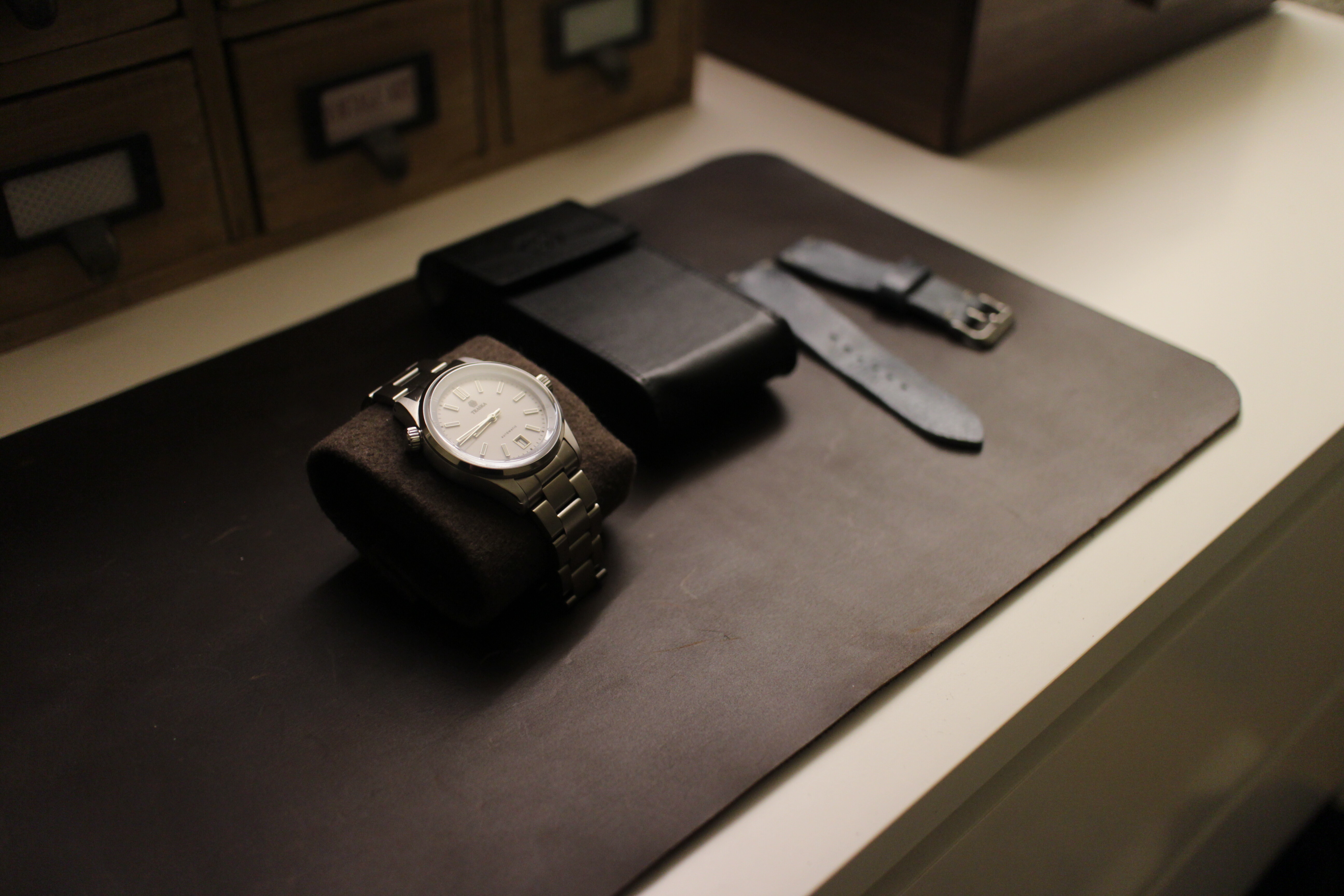 En dan nog de grootste verrassing: ik had al een mooi blauw-grijze lederen band gekocht van finwatchstraps, daar ik meestal meteen de stalen band van m’n horloges haal (teveel seiko’s gehad waarschijnlijk).
