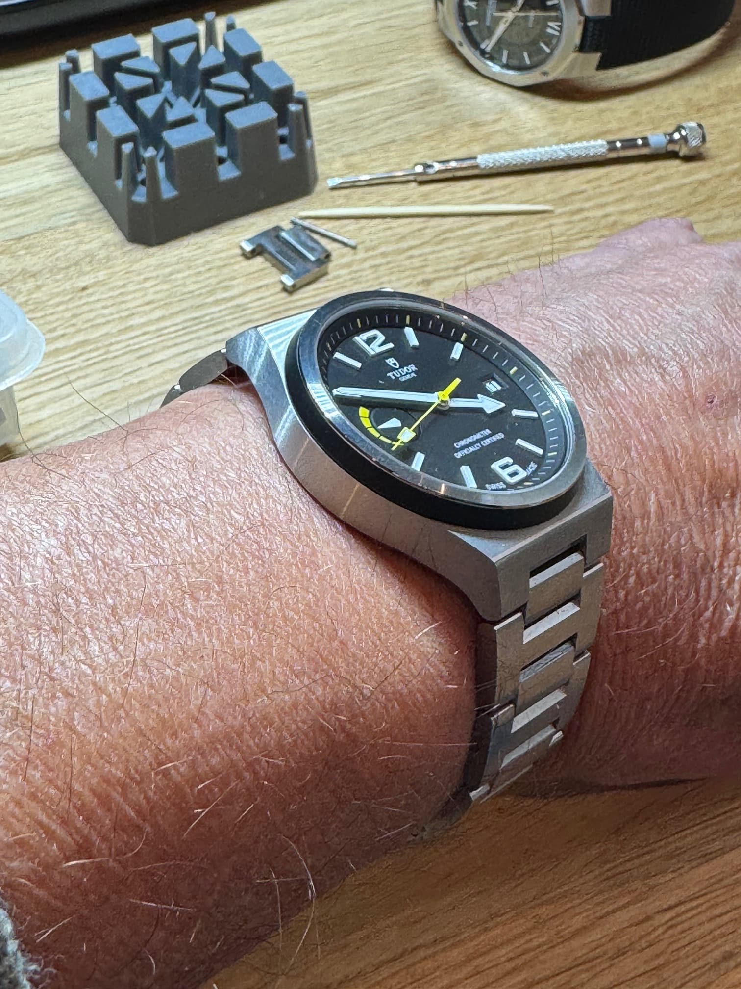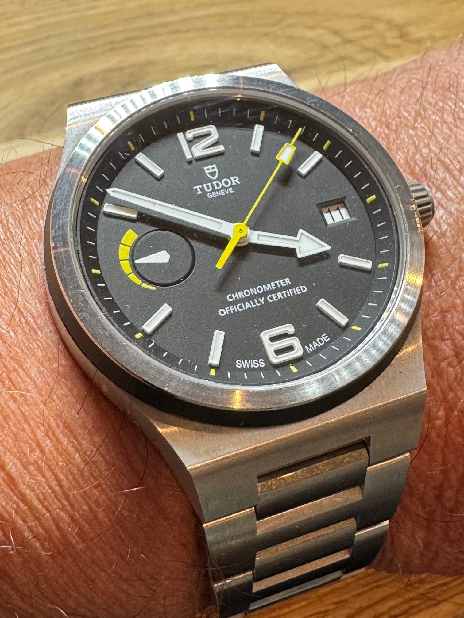 De North Flag gaf echter direct een “hey wat een gaaf horloge” effect. Het aangeboden horloge was nog redelijk recent (2021) en in zeer mooie staat. Na het doen van mijn huiswerk (was net op vakantie dus tijd zat om veel video’s te kijken) was de interesse serieuzer geworden; interessant model met Tudor’s eerste inhouse uurwerk. De stoere, gematteerde no-nonsens look met zijn strakke lijnen (ook van de band) is helemaal in mijn straatje. De gele secondewijzer, de kleine gele 5-minuten markeringen en de gele indicator van de gangreserve geven het horloge net dat beetje extra om een in de basis redelijk eenvoudig (saai?) model, een fris en sportief accent te geven.