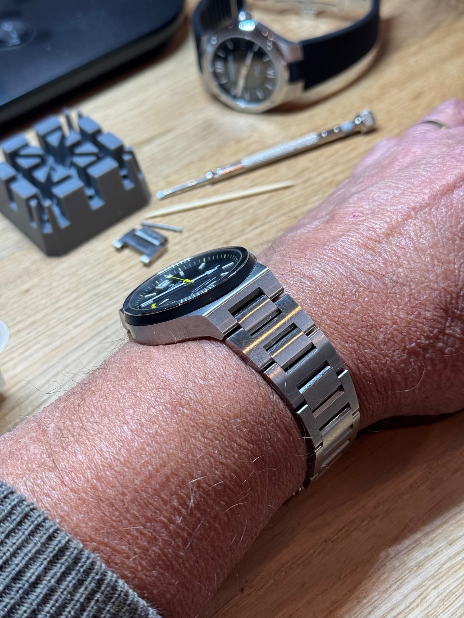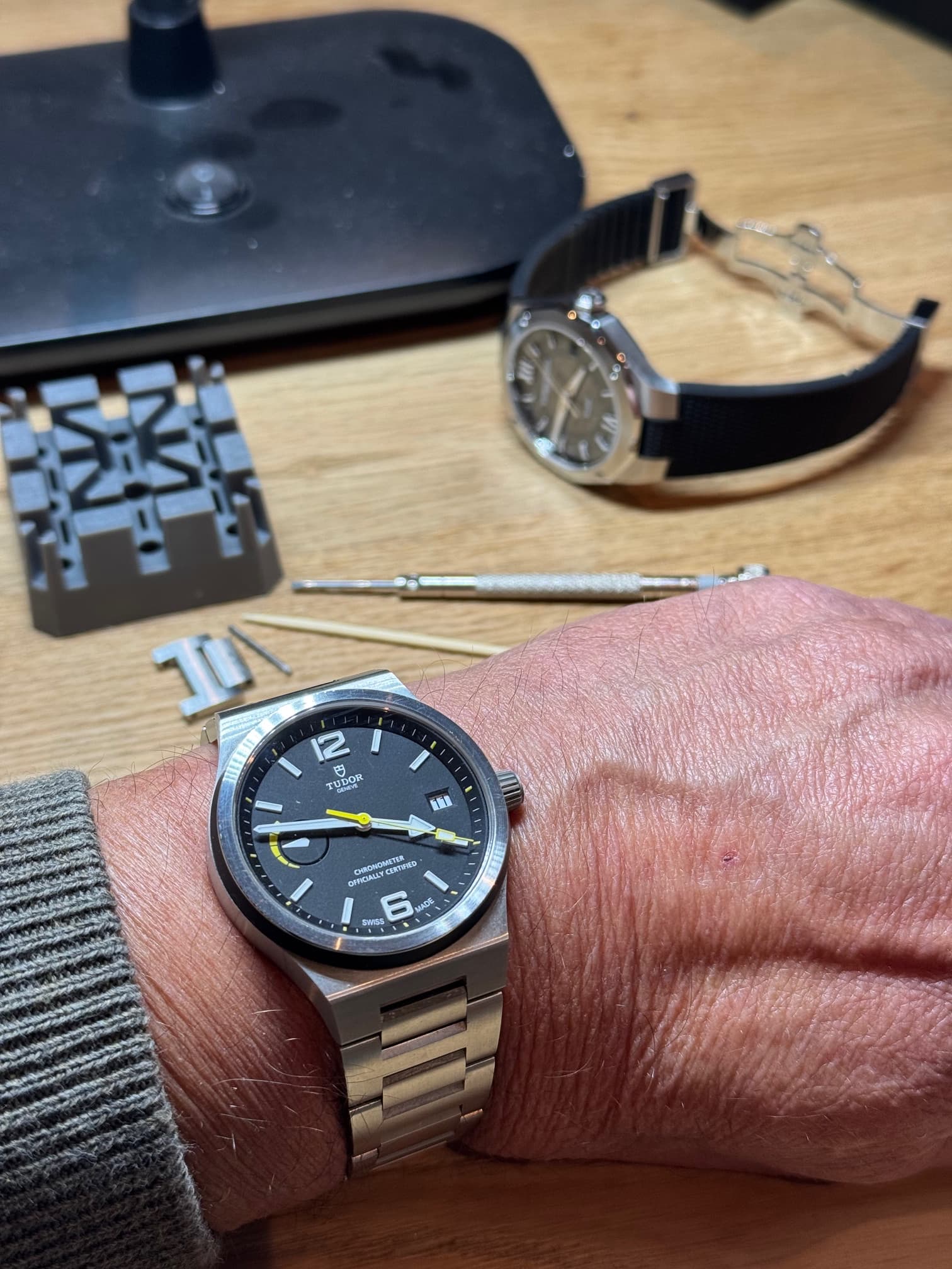 Het enige punt van twijfel betrof toch wel de dikte van het horloge. Ruim 13,5mm is eigenlijk iets boven mijn voorkeur… De vorige eigenaar (maar ook diverse reviewers) gaf aan dat het horloge effectief iets minder dik droeg dan de maat doet vermoeden. Uiteindelijk de knoop doorgehakt en de koop gesloten. Het horloge kwam perfect veilig verpakt binnen en het was een aangename eerste kennismaking (na het passend maken van het bandje). Het is inderdaad zeker geen dun horloge maar te dik is ie wat mij betreft ook weer niet. De achterkant zakt eigenlijk een beetje in de pols. De korte overgang naar de geïntegreerde band laat het horloge ook iets compacter lijken. Ben er helemaal mee in mijn sas! Nu op zoek naar een rubberen bandje! Dit is er niet origineel voor de North Flag maar volgens een zoektocht op google zijn er passende alternatieven. Ik kwam ergens een tip tegen over een band voor een Tudor Black Bay die perfect zou passen. Helaas kan ik die tip niet meer terug vinden. Mocht iemand een passende oplossing weten (bij voorkeur met vouwsluiting); ik hoor het graag!