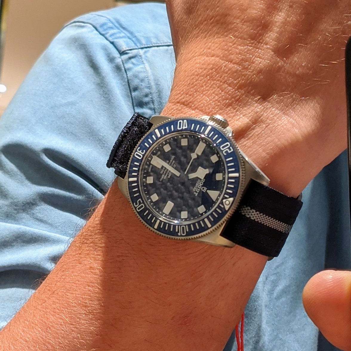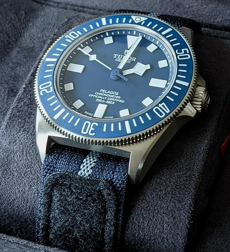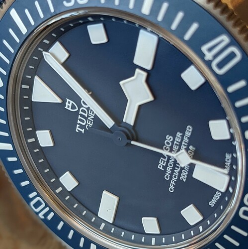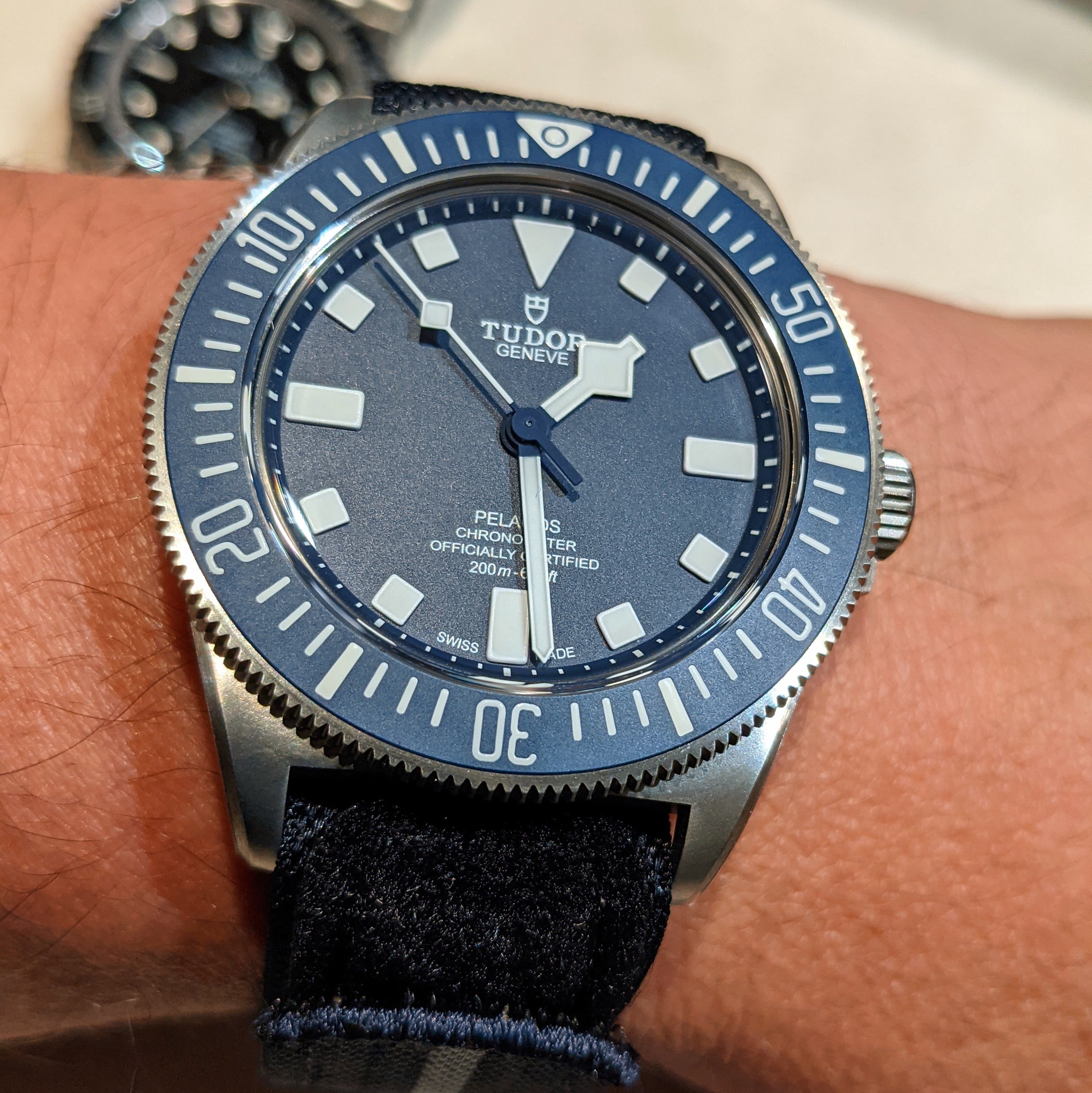 Eigenlijk was ik de langverwachte nieuwe Tudor belofte al bijna weer vergeten, tot het HF topic weer bovenkeam vlak voor de release date. De speculaties waren al in de richting van een Pelagos, terwijl velen, waaronder ikzelf, stiekem hoopten op een Submariner versie. Gelukkig wel een blauwe versie! Nog mooier dat het blauw van de FXD flink wat donkerder is dan de gewone Pelagos. Die vond ik te fel, maar deze Navy versie is subtieler. In het licht varieert het nog behoorlijk, wat het ondanks de matte tinten van dial en bezel alles behalve saai maakt.