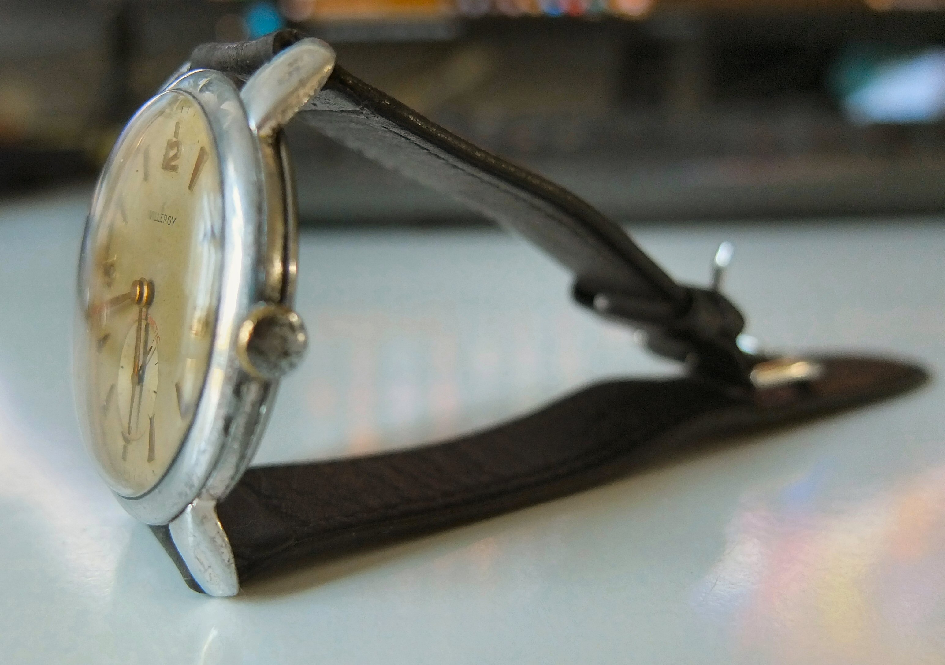 Nadat dit alles was gedaan heb ik het horloge weer in elkaar gezet. Het ging er weer als een netjes onderhouden vintage horloge uitzien en werd daartoe ook nog even van een nieuw passend zwartleren vintage bandje voorzien. Wat mij deed bedenken dat er nu echt weer eens een Rikketik beurs moet komen, want ik begin aardig door mijn voorraadje new old stock vintage bandjes heen te raken. Van een normale kijkafstand van zo’n 30cm ziet het best grote Villeroy horloge er aan de pols