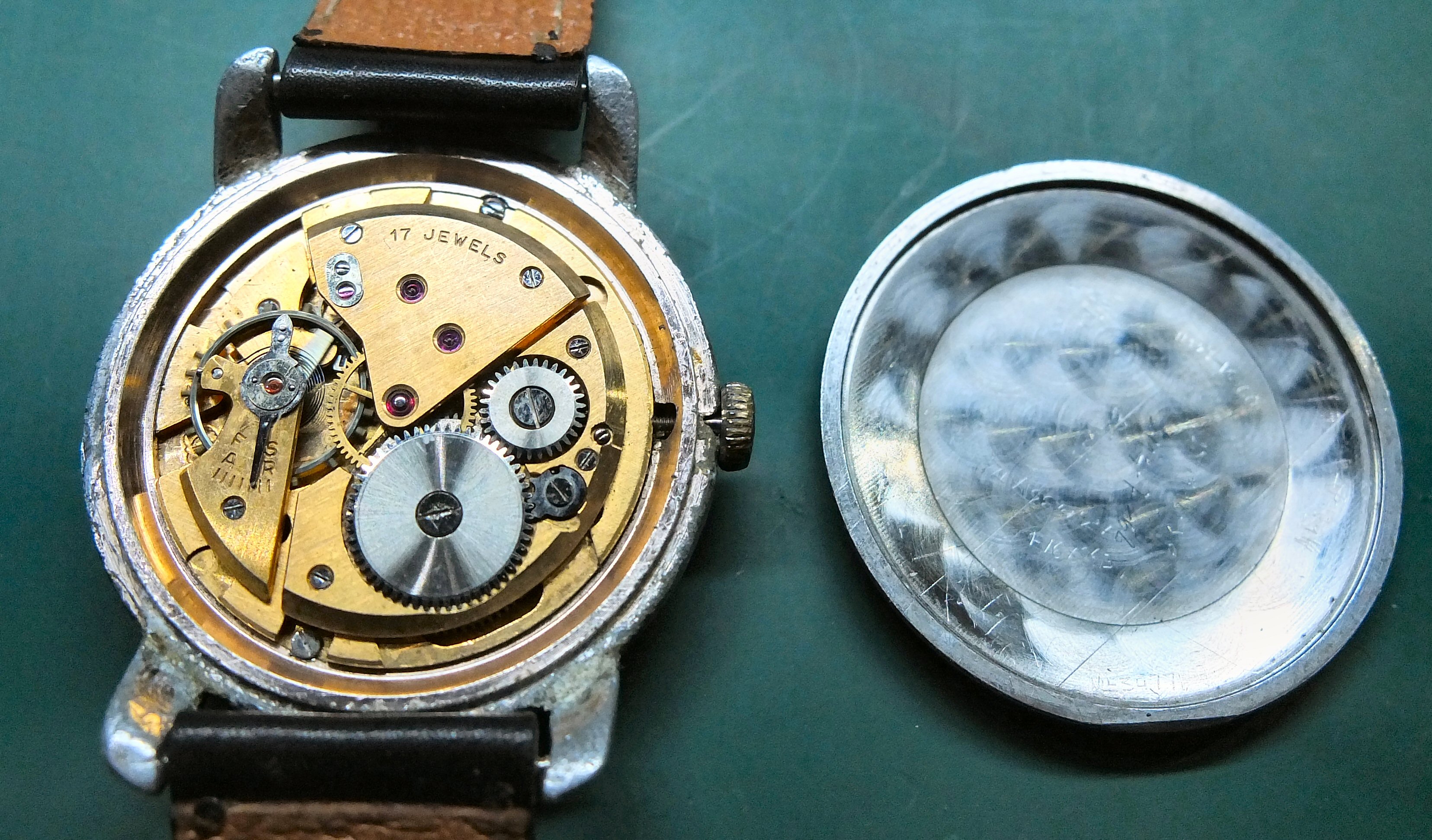Het horloge verkeerde, zoals ik het kocht, in een ‘redelijke’ staat, d.w.z. de kast zag er niet meer zo fraai uit. Dat was voornamelijk te danken aan de eigenschappen van het aluminium, dat nu eenmaal niet bekend staat om zijn slijtvastheid, althans niet deze vroege kwaliteit aluminium legering uit het begin van de jaren ’50. Mijn theorie is, dat na de ontwikkelingen in met name de