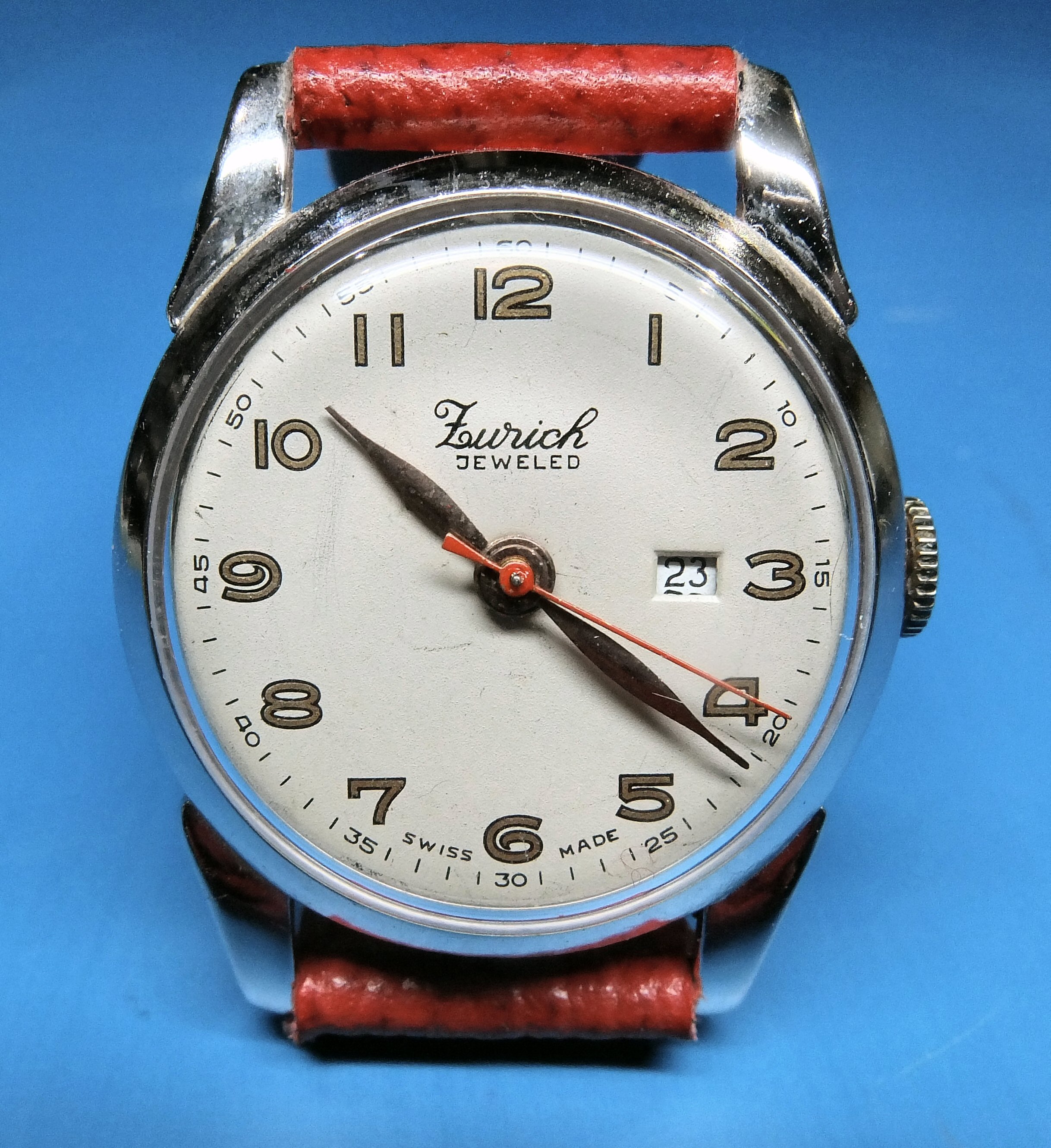 Ik bezit, naast dit nieuw verworven Villeroy exemplaar, merkwaardig genoeg nog een ander horloge met een aluminium kast. Een ‘Zürich’. Ook al zo’n obscuur merk waar volstrekt niets over terug te vinden is. Het is een eenvoudig penanker horloge, met een simpel design en de voor die tijd gebruikelijke afmeting van 32mm, dat ooit eens meekwam in een lotje ‘junk’ met voornamelijk defecte penankeruurwerkjes, ook van rond de jaren ’50. Nog merkwaardiger is dat het penanker klokje met een verguld aluminium schoenpoetsdoos kastje (ook de achterzijde is van aluminium) nog in een bijna perfecte conditie verkeert en ook nu nog steeds loopt, zelf na nog eens zoveel jaar nadat ik het verwierf. Je moet ‘m af en toe eens een zetje geven, maar hij doet ‘t nog steeds. Misschien dat penanker specialist @Scudo hem eens zou willen nakijken om hem weer helemaal perfect te laten lopen?