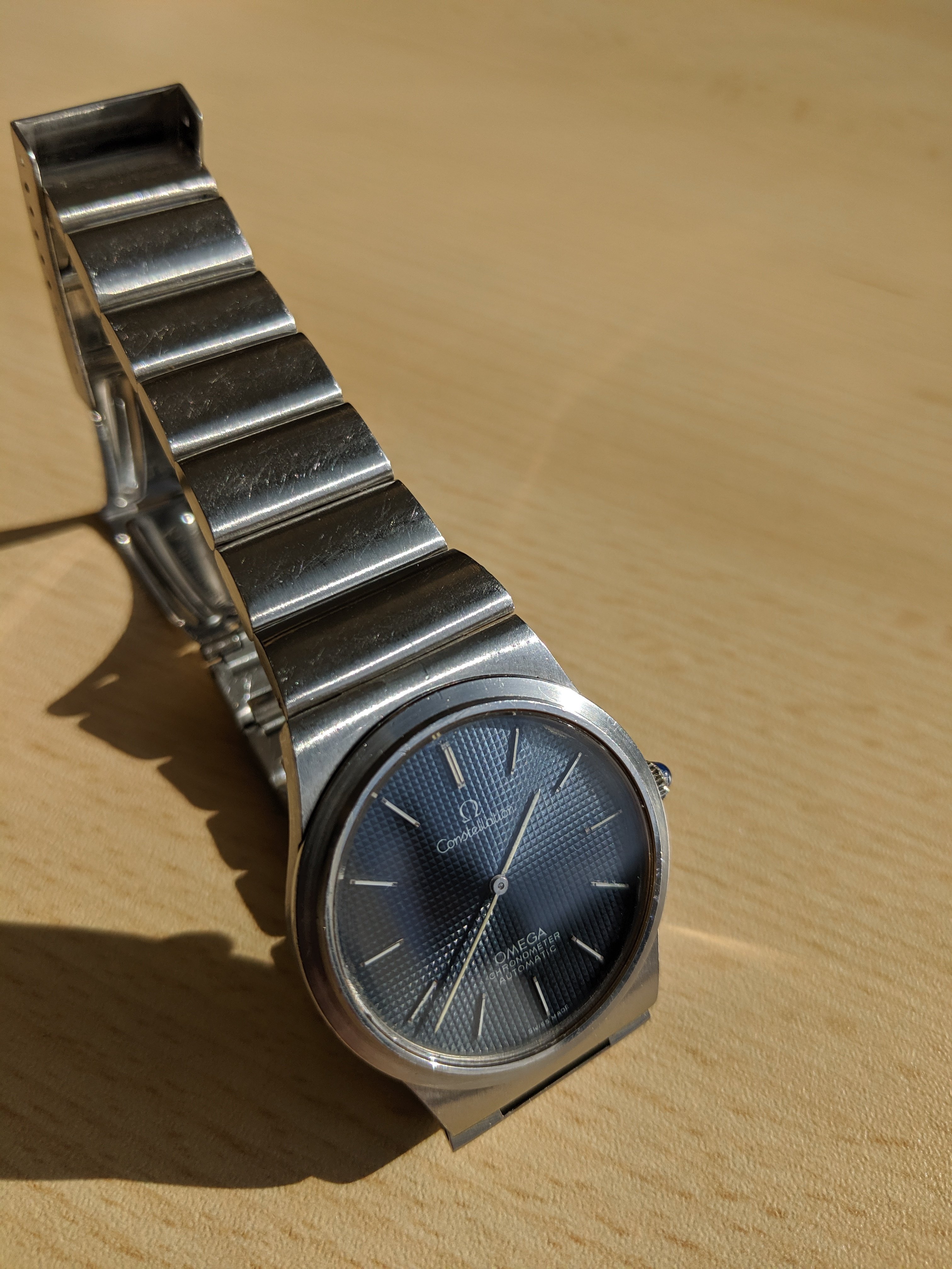 Eind jaren '60 begin jaren '70 bracht Omega deze Constellation met caliber 712 uit, dun zonder seconden wijzer en sommige met een blauwe wijzerplaat.