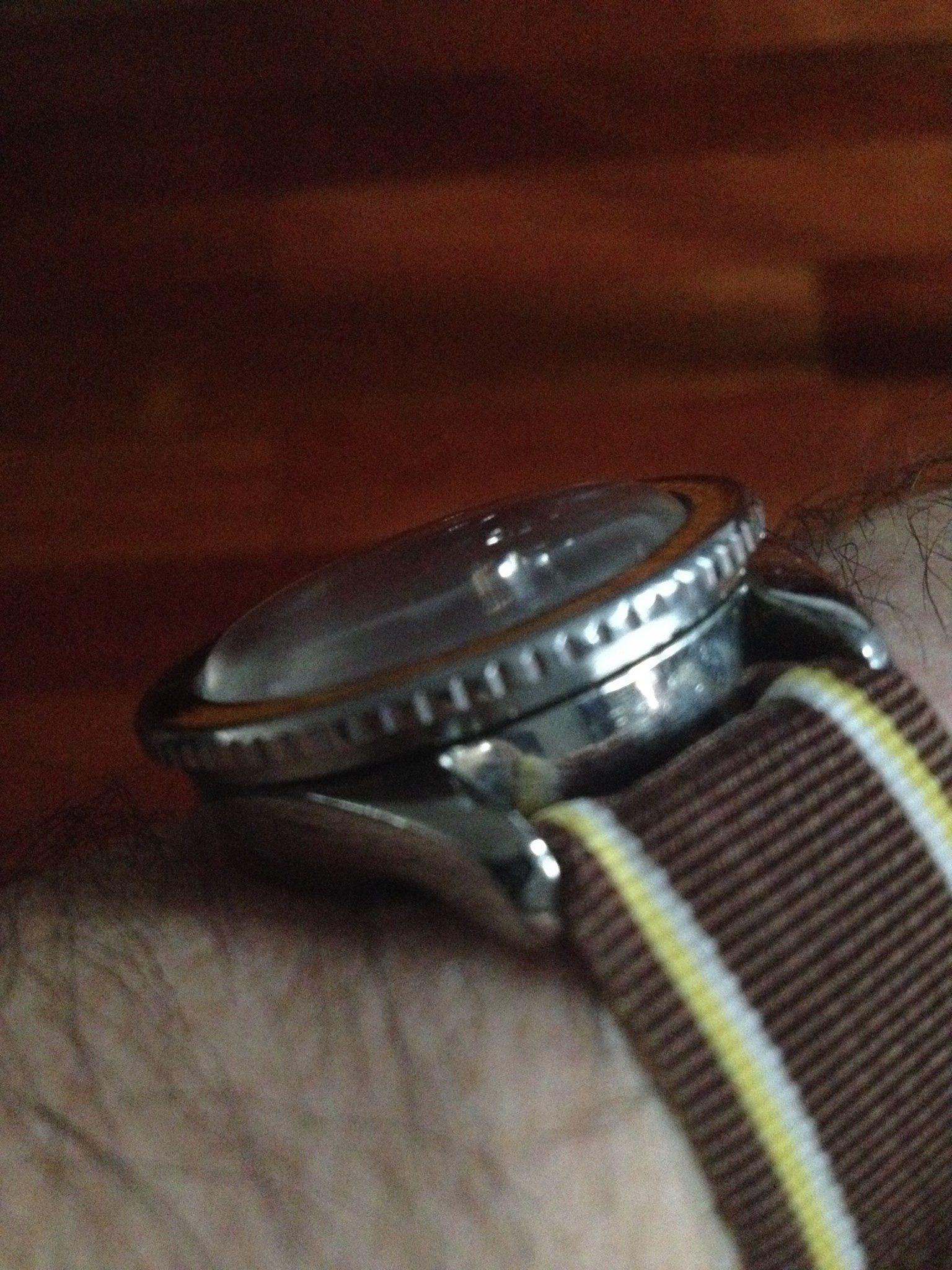 De kast is assymetrisch waardoor de bezel iets naar links lijkt over te hellen. Mooi domed plexi glasje ook.