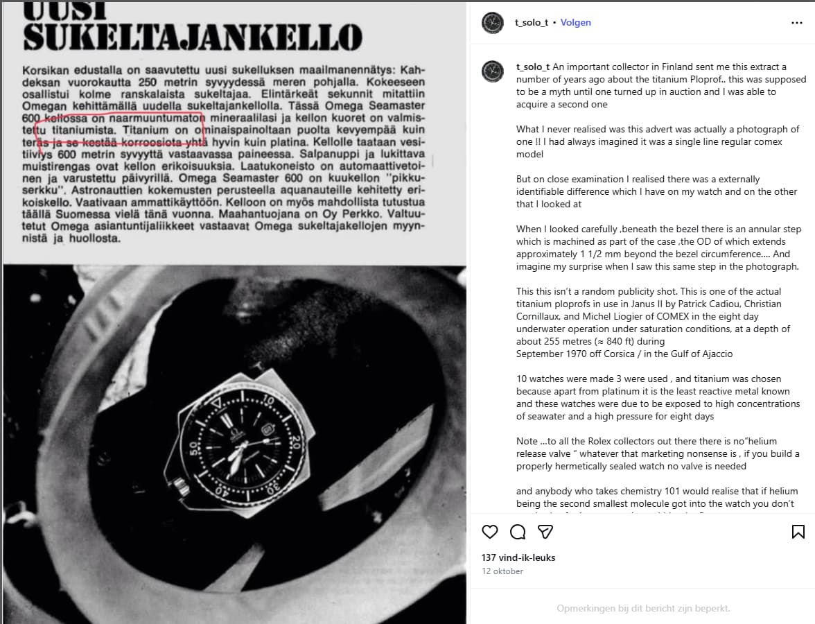 Dat bedoel ik dus met onderbelicht in de gangbare bronnen, terwijl titanium in 1970 zeer vooruitstrevend was. Nu had Omega al een titanium prototype in 1969, maar dat is een ander verhaal.