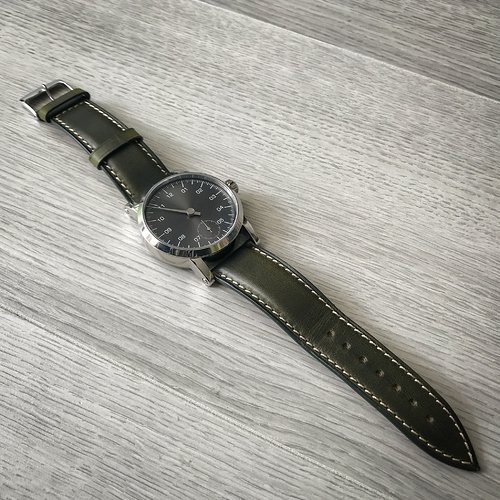 Het leren bandje is van Watchgecko. Ik vond de canvas band van Edwinek erg gaaf staan, goed gekozen, maar ik heb met andere horloges al vaak een iets meer ‘military look’ en wilde me ergens toch onderscheiden, dus gekozen voor iets anders. Voor ongeveer €50 is het voor mijn doen een ‘duur’ bandje, maar is het helemaal waard. Zacht en soepel, vormt zich meteen naar mijn pols, maar toch heel stevig en solide. Het groen komt meer naar voren als het bandje buigt.