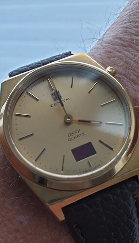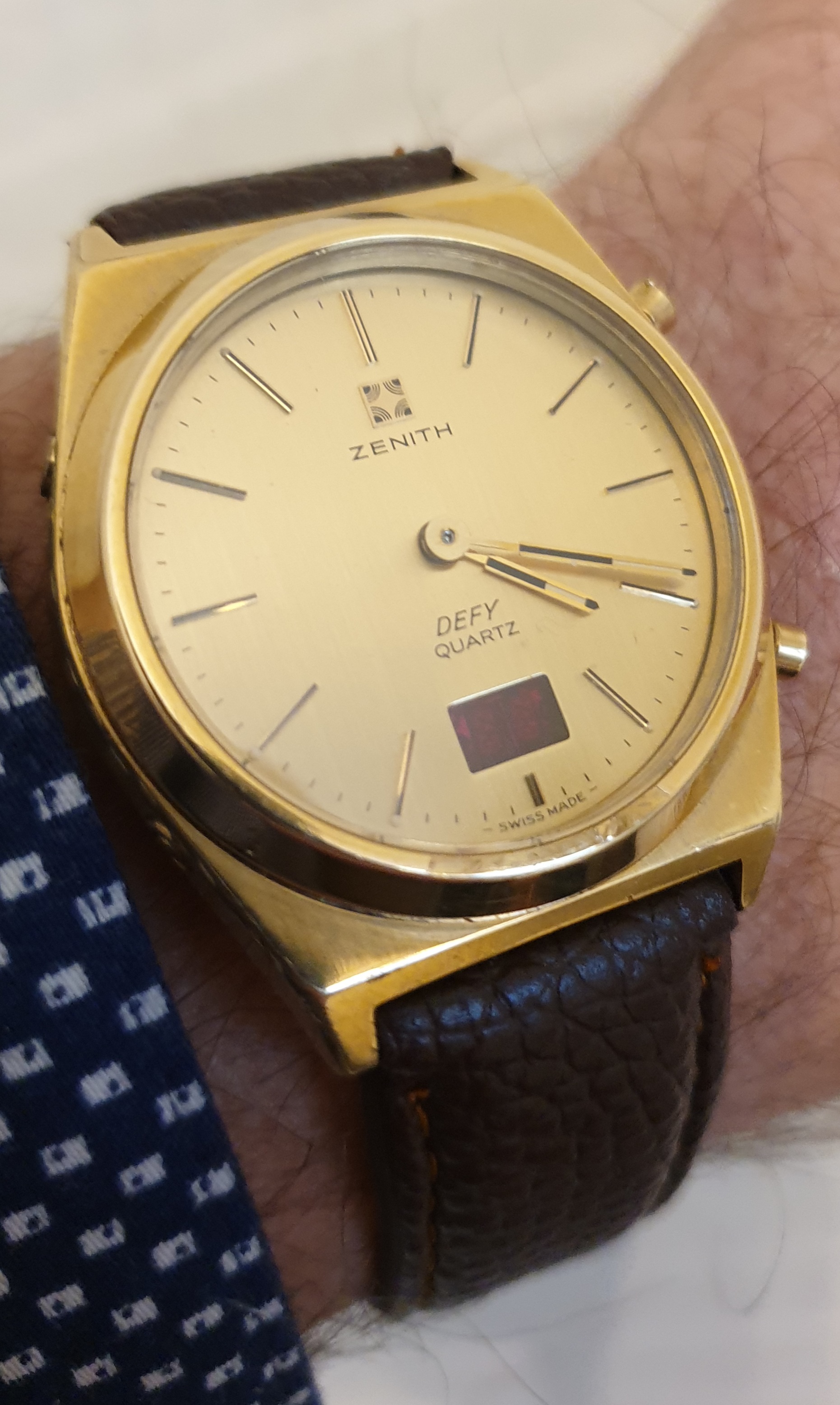 Hoewel er de laatste tijd een groeiende belangstelling is voor de jaren 70 ana-digi’s is er voor de rest weinig informatie over dit model te vinden (dit is een site met wat info). Er worden weinig modellen aangeboden in goede staat. Die van mij ziet er nog ok uit, wat kleine beschadigingen op de bezel, en ik ben er blij mee. Mooi gold-plated horloge met een eigenwijs verhaal, past wel goed in mijn Zenith verzameling.
