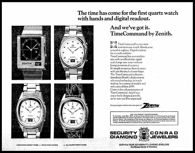 Dit is een advertentie uit 1977 van de Zenith Time Command modellen.