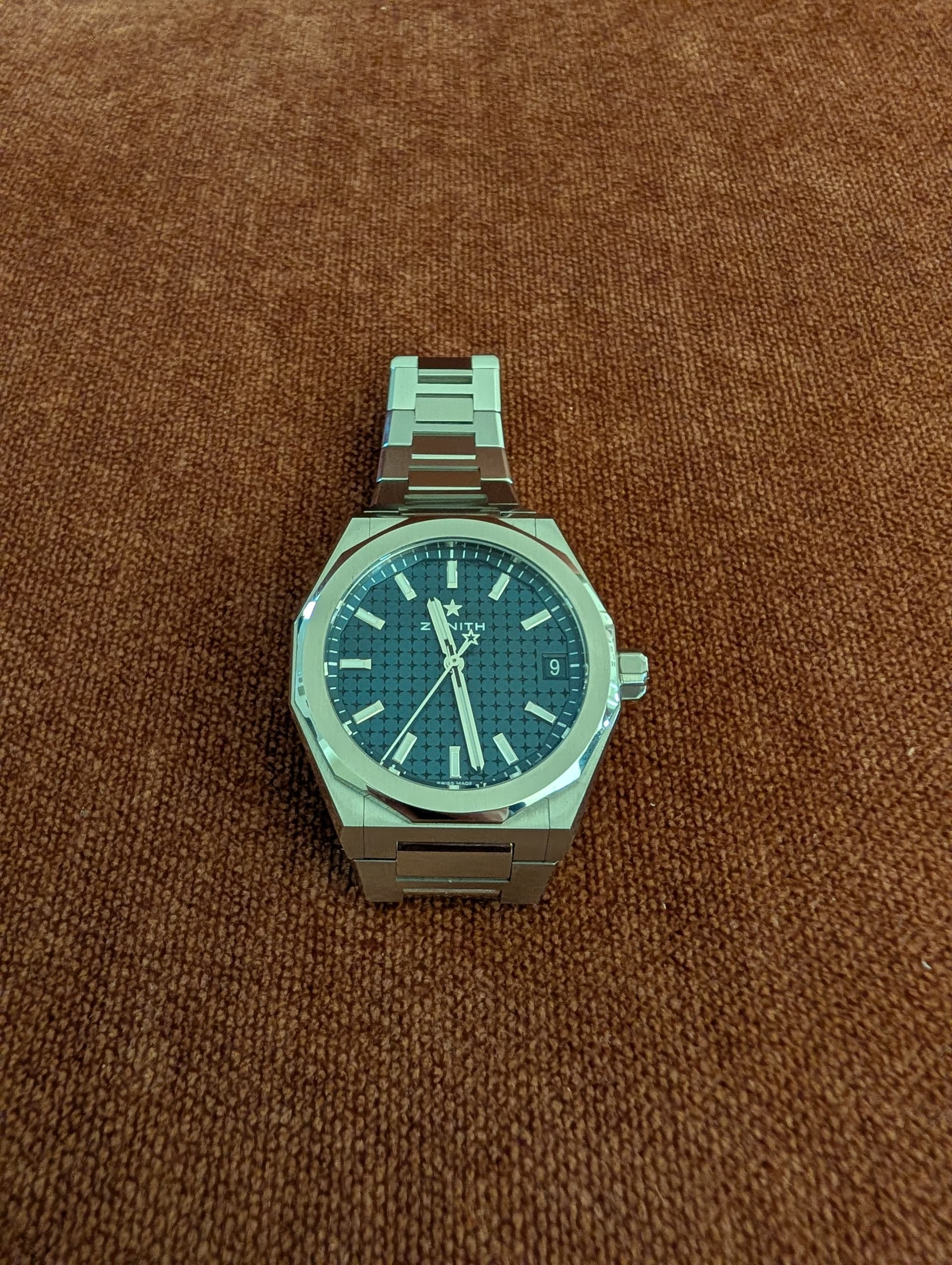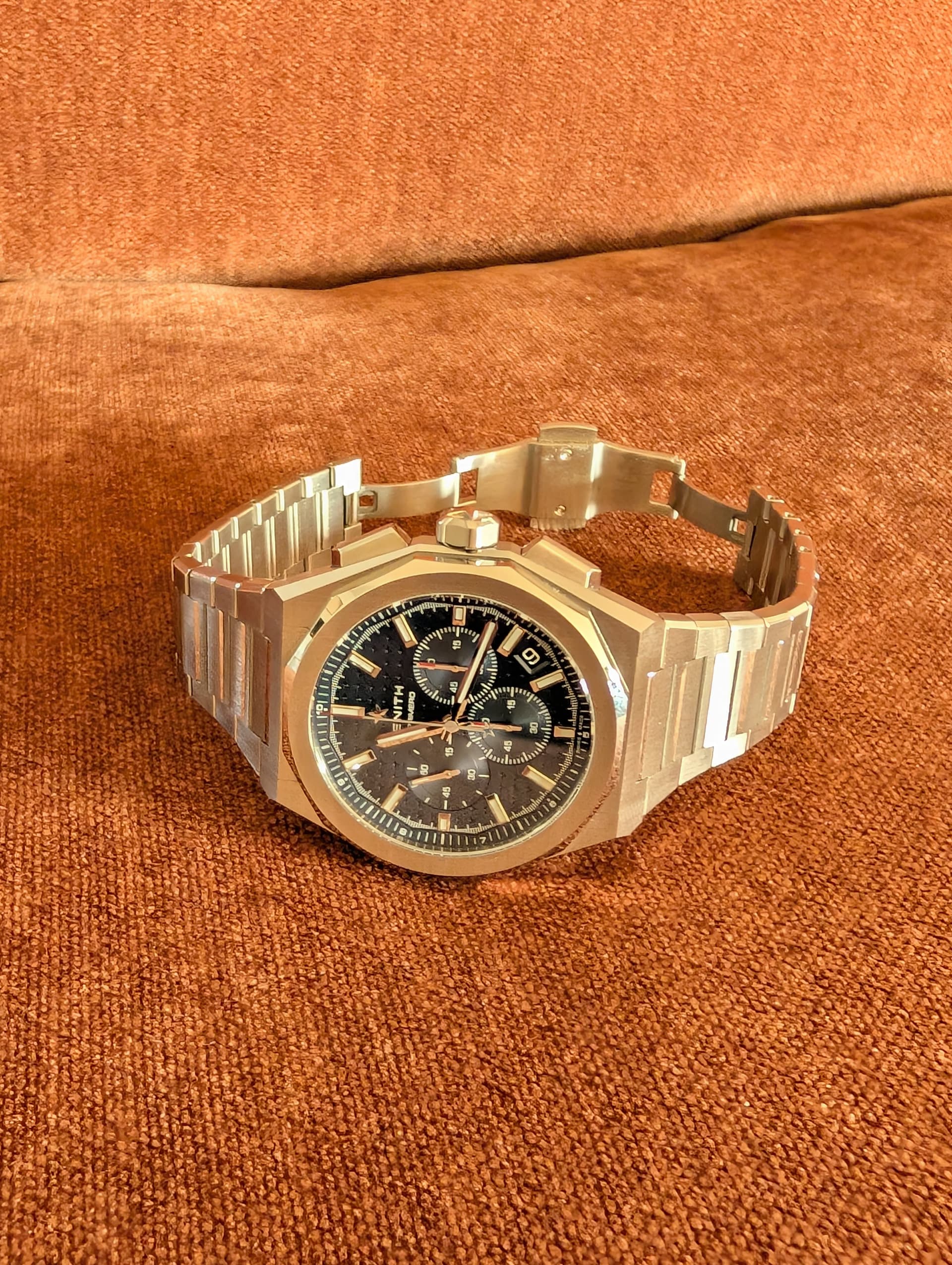 Enkele jaren verder, zij draagt de seiko af en toe maar haar oog valt ineens op een Zenith Defy wanneer ze toevallig aan mijn bureau staat terwijl ik zoals vaak weer naar horloges lig te loeren. Ze vond het een prachtig horloge en zonder de small second ook in 36mm verkrijgbaar.