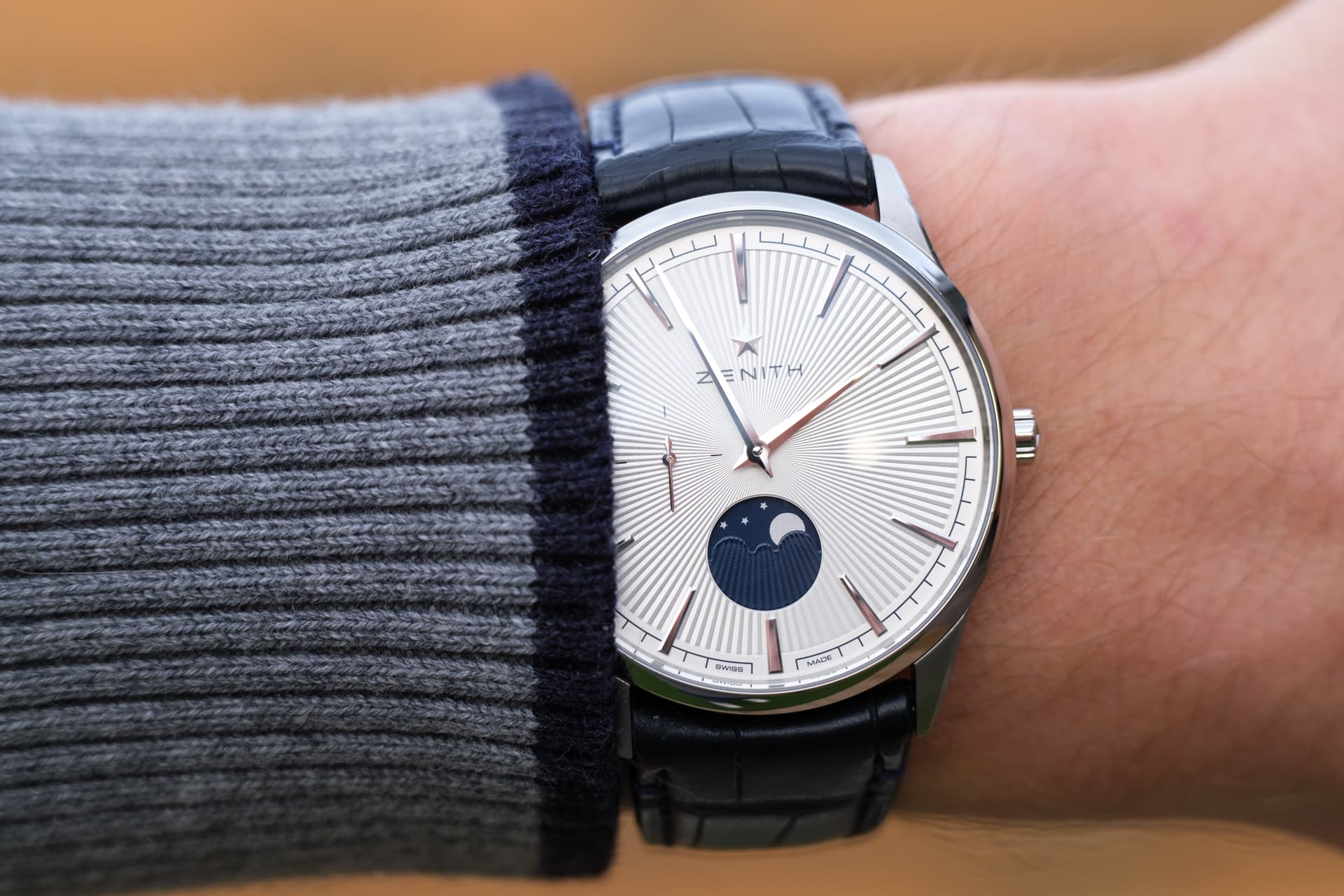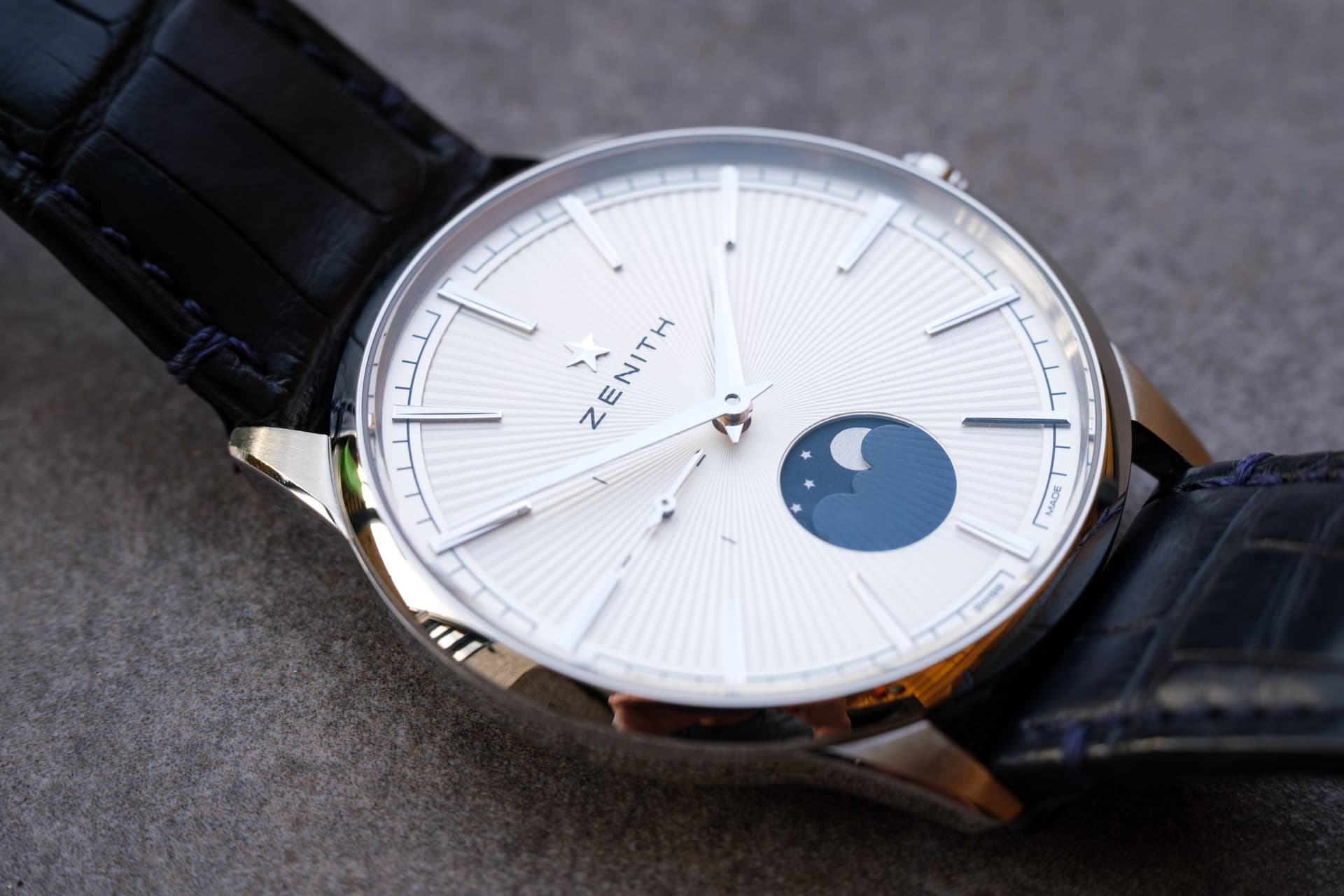 Na een middag Amsterdam had ik 3 van de 4 horloges kunnen passen en bekijken. Helaas hadden ze allemaal iets waardoor ze afvielen. De GS vond ik prachtig, maar de 22mm stalen band voelde en oogde erg massief. De Chronomaster had te platte lugs, waardoor de lederen band in een te grote hoek omlaag viel om mijn pols. De Speedmaster was prachtig en qua uitstraling echt wel anders dan mijn zwarte hesalite, maar tegelijkertijd niet anders genoeg. Alleen de Zenith Elite Moonphase was nergens te bekennen. Niet in Amsterdam, Antwerpen, Brussel, Zenith netwerk…