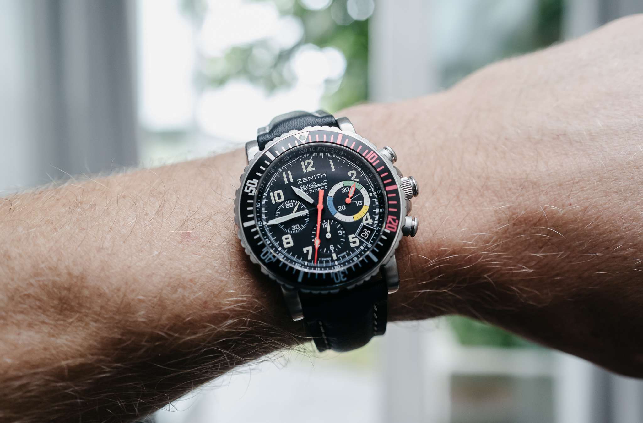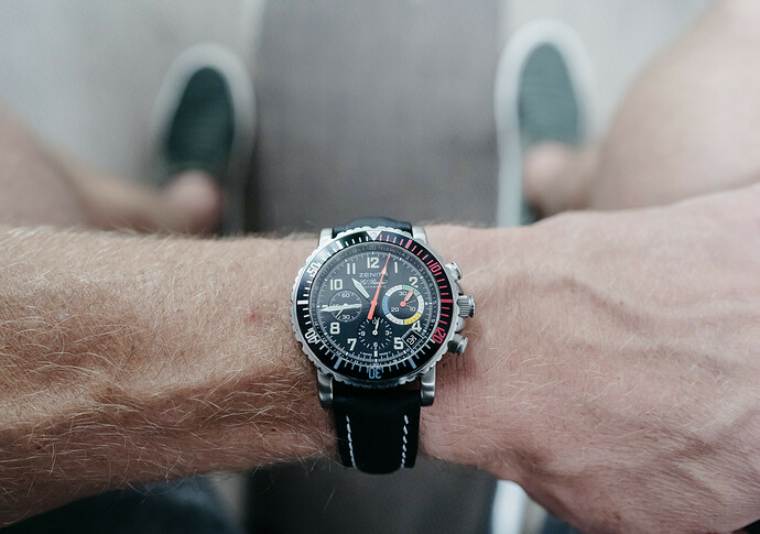 Hoewel de 817 fantastisch is, is de prijs dat minder. De Sinn is met zijn bijna 19mm veel te vadsig. Zenith heeft in 2014 een soort re-issue van de Flyback Rainbow geproduceerd, alleen werd dit de Zenith Stratos Flyback Rainbow. Dat horloge sprak me veel minder aan, mede door de 45.5mm diameter. En te gekke afgekapte cijfers.