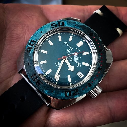 Met die snorkelaar op de wijzerplaat zou ik de kompas ring juist wat raar vinden. Ik vind em zo beter passen.