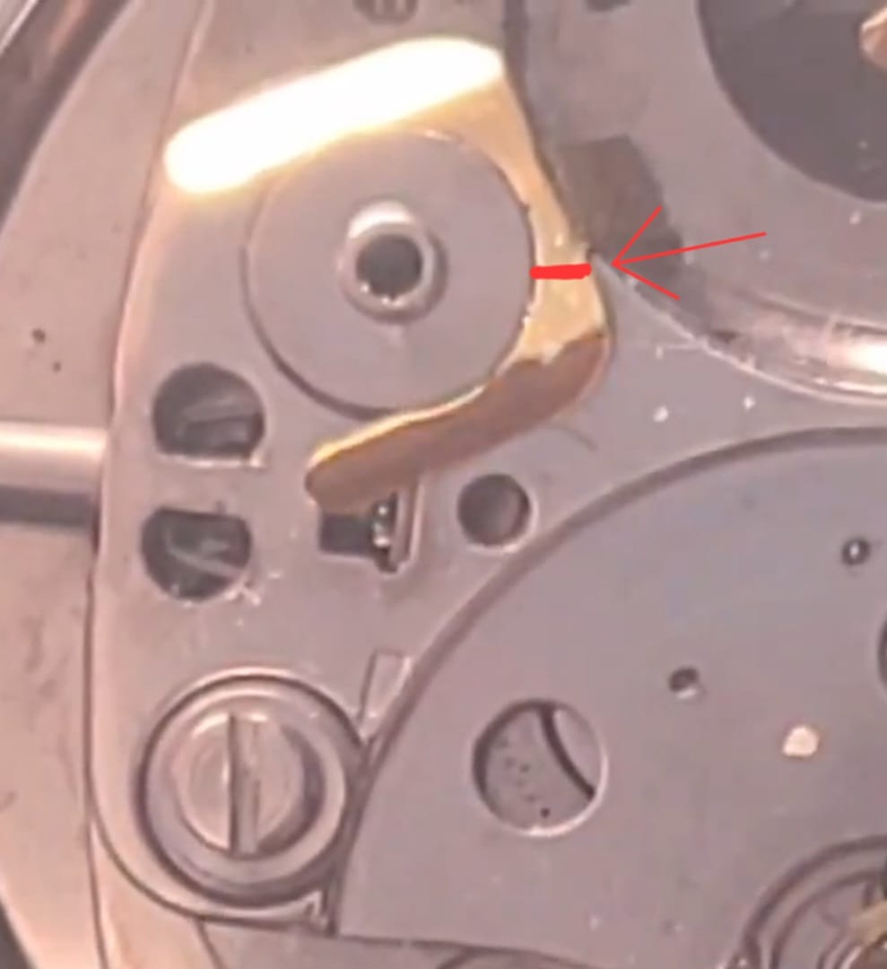 Er was 1 pootje van de ‘u’ afgebroken. Deze heb ik met een heel klein puntje rodico op de juiste plaats gelegd. Daarna de nodige puntjes gesmeerd, nieuwe zilveroxide batterij erin en gaan, dacht ik. Maar nee, bij het erin leggen van de batterij gebeurde er niks, ook niet na een paar zetjes geven. De hoop was wel echt ver voorbij. Het contactpuntje voor de min-pool van de batterij drukte vrij hard op de batterij, waardoor ik het idee had dat ik hem een beetje op zijn plek moest helpen.