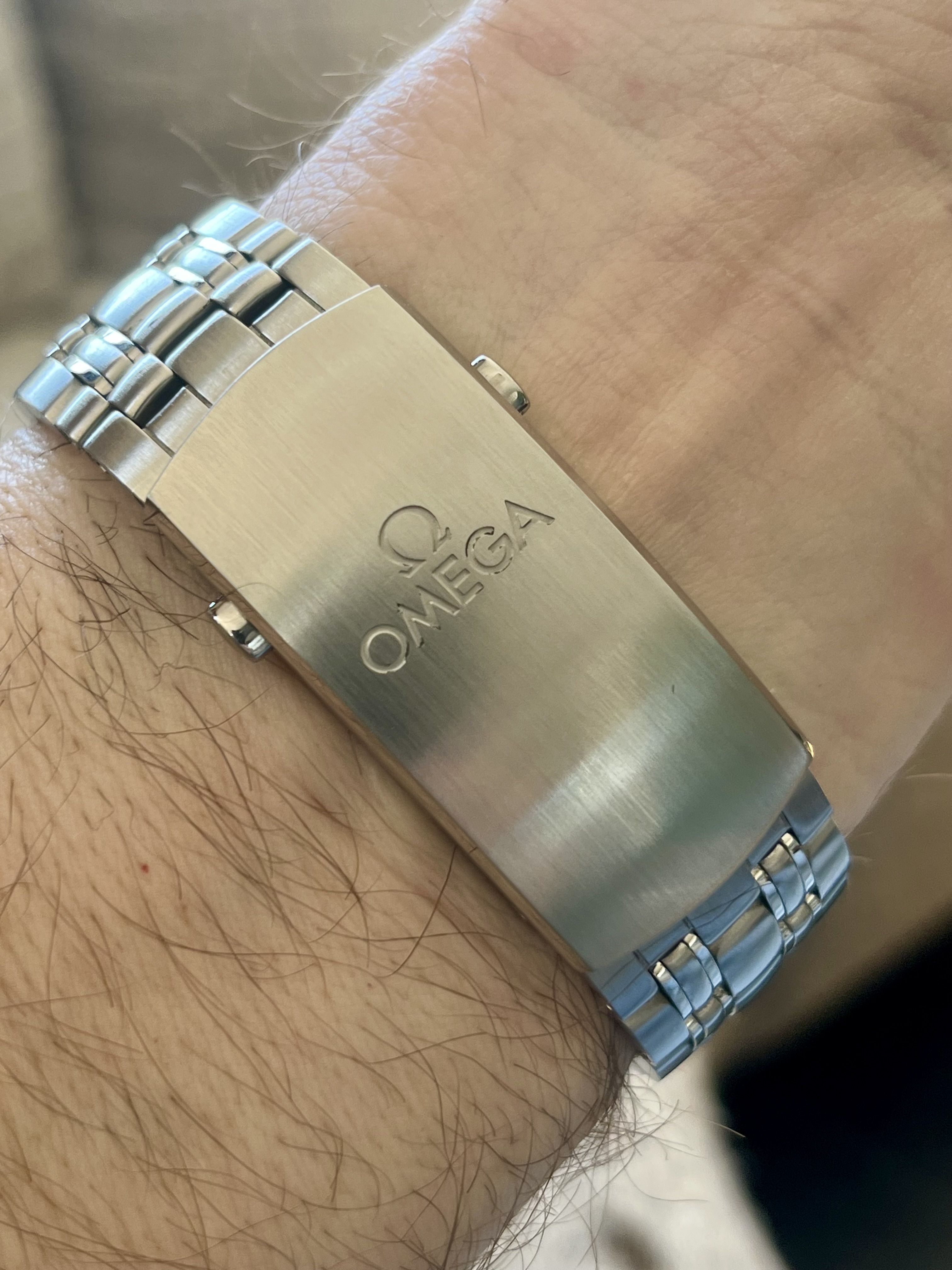 De moderne dikke en grove 20mm vond ik niets, het horloge wordt ineens een klomp staal. Met name de enorme sluiting vind ik niet fijn. Deze steekt uit in tegenstelling tot die van een rolex of klassieke SMP Omega, waardoor hij veel klappen en dus dus krassen krijgt.