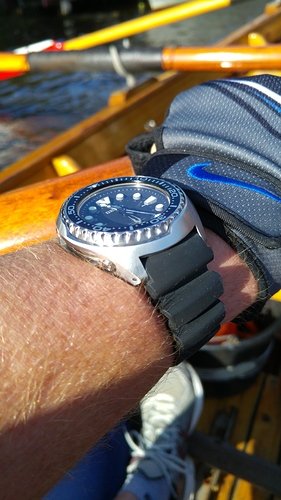 Ik heb m’n Murphy Vostok om vandaag. Dave zette die te koop op het PMWF destijds als één van z’n test horloges. Ik kon kiezen welke bezel ik erin wilde hebben, vond deze wel leuk (Coke bezel) Op mijn verzoek heeft hij vervolgens een bij hem voor mij afgeleverde Chinese stalen band en het hele horloge geparelstraald (bead blasted) of hoe noem je zoiets in het Nederlands.