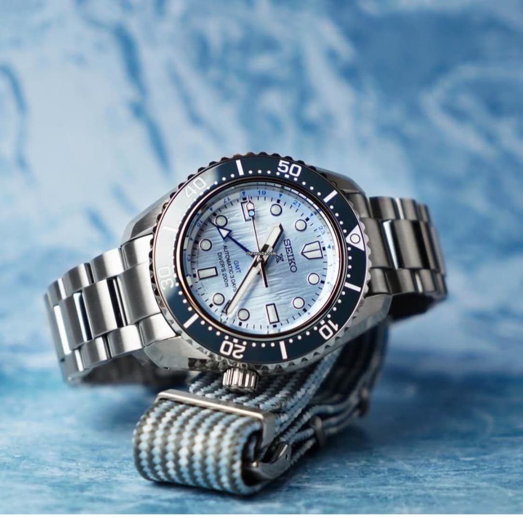 Limited Edition. Prachtig design kast! Een Dial op gletsjer geïnspireerd, reageert inderdaad als een gletsjes op het licht. Een accuraat Gmt uurwerk met 72 uur gangreserve!