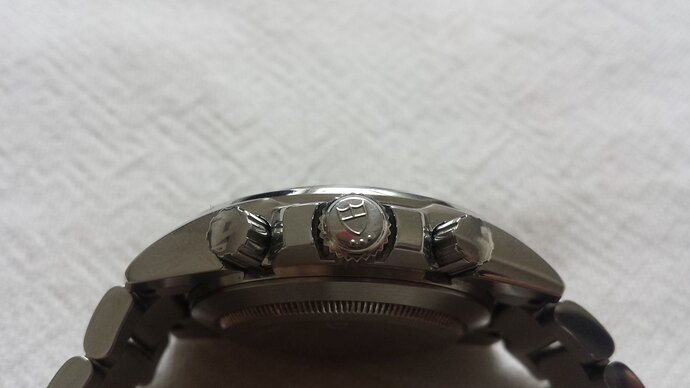 Klopt, daar is de Quick set datum-knop. Ik denk dat hij daar is geplaatst en niet als functie in de kroon door de subdial op 3 uur. Er zit ook een tooltje bij in de vorm van een Tudor-logo om de datumknop te bedienen. Natuurlijk werkt het doordraaien van de wijzers ook gewoon om de datum te verstellen.