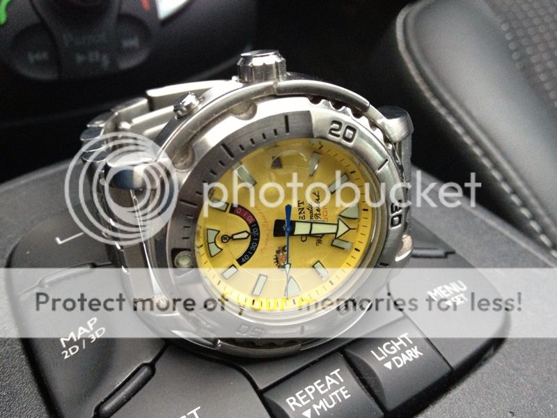 voor mij uberhaupt n maatje te groot. maar ik blijf t logo op n net horloge vinden kunnen, echter op zo n sportieve duiker n ware afknapper. daarnaast vind ik de verhouding vd wijzer niet zo. ze mogen wat mij betreft wat forser wezen tov de indexen (of misschien de indexen iets smaller) en de minuten wijzer zou ik vooral bij n duiker iets prominenter maken. de lume vd uren lijkt me nl dominanter in dit geval.