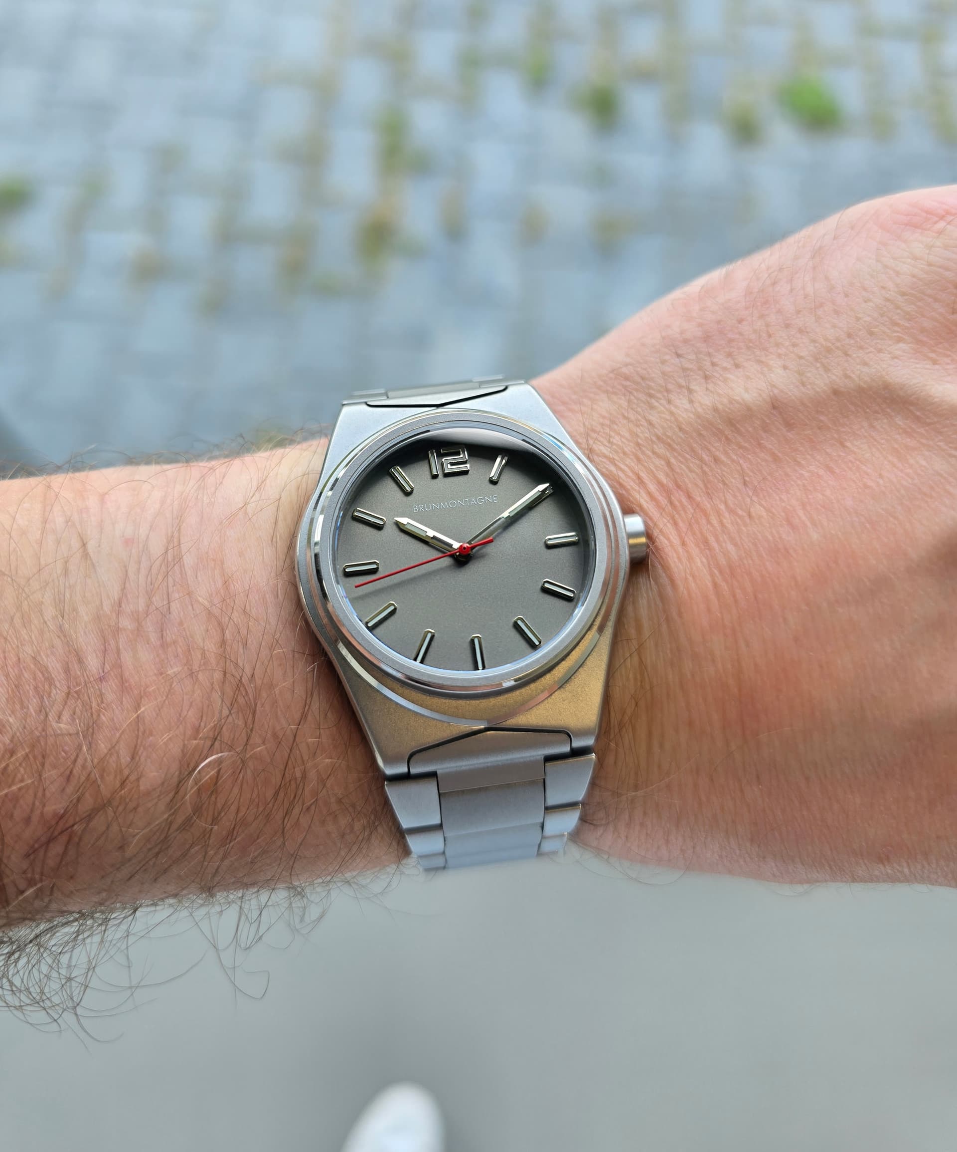 Ik stap wat laat in dus mijn mening zal niet veel meer toevoegen en het alleen laten bij een lofzang vind ik afbreuk doen aan je initiatief. Daarom toch een kanttekening op je ontwerp. Ik vind hem gaaf bedacht, mooie lijnen qua kast en echt een eigen gezicht. Ook vind ik de wijzerplaat wat kaal. Ik kan me voorstellen dat er bewust voor gekozen is, omdat het een bepaalde stijl is. Toch zou ik wel eens een variant willen zien waarbij je naast de merknaam bovenaan, wat meer tekst op de wijzerplaat laat zien. Denk aan ‘automaat’ (bewust NL), of toch iets zoals de klassieke Rolex Oysterdate doet. Onder de naam je type naam en op de onderste helft van je wijzerplaat iets zoals Rolex deed ‘Precision’ (maar dan een eigen term). In mijn ogen geeft dat de wijzerplaat meer balans. Dat past bij de uitgebalanceerde lijnen van de kast, en ook bij de dress style van het horloge. Nu is de kast qua lijnenspel helemaal in balans en leunt de wijzerplaat iets te veel naar boven. Ook omdat Brunmontagne vrij hoog gepositioneerd staat. Dat past wel, en wellicht beter als er onderaan ook iets staat.