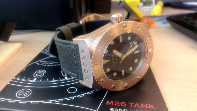 Maar mān oog was gevallen op de M26 Tank. Ik had em soort van in 2012 al in PVD gezien, maareh dan van VDB :+ Daar was de klik er niet. Enerzijds door de kleurenset die ze hebben gebruikt, anderzijds door het formaat. Ik was overwhelmed toen. Vond zelfs de VDB2011 niet kunnen. Maar,na wat Panerai hommages (tja, ze zijn wel degelijk ergens goed voor ;)), Pellikaan en nog wat andere forse horloges waren de grenzen verlegd. Dus de Tank⦠oh yeah!