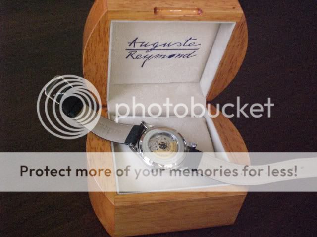 Zoals beloofd, bij deze mijn post over de nieuwste aanwinst: De Auguste Reymond. Het horloge ziet er kwalitatief zeer goed uit en loopt tot nu toe zoals het hoort. De klok is voorzien van saffierglas en een ETA 2824-2 uurwerk met zichtbodem. Dit alles komt in een hoogglans houten doos, voor een zeer vriendelijke prijs.