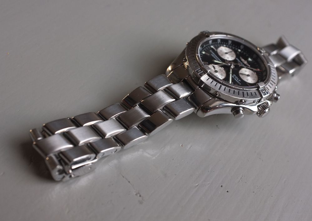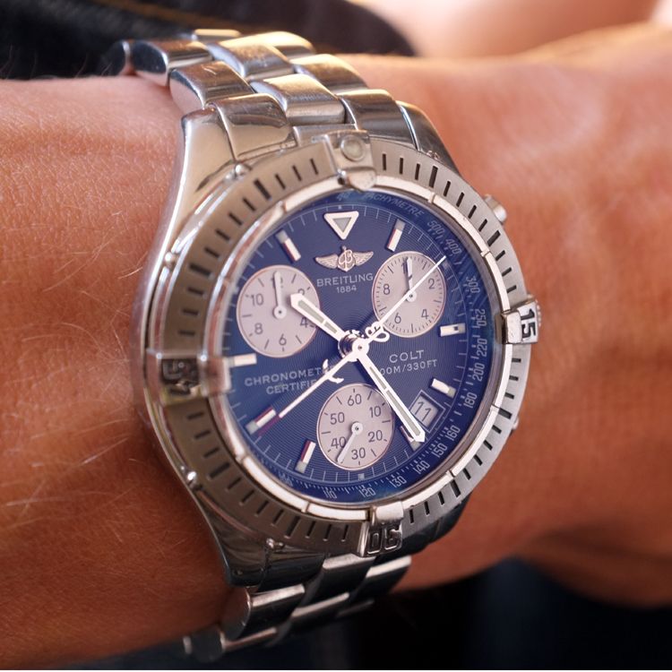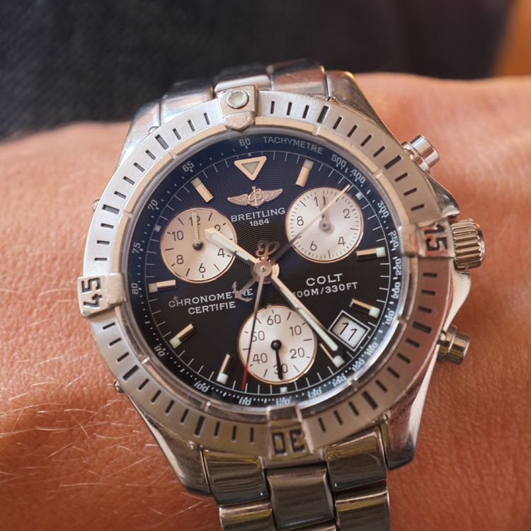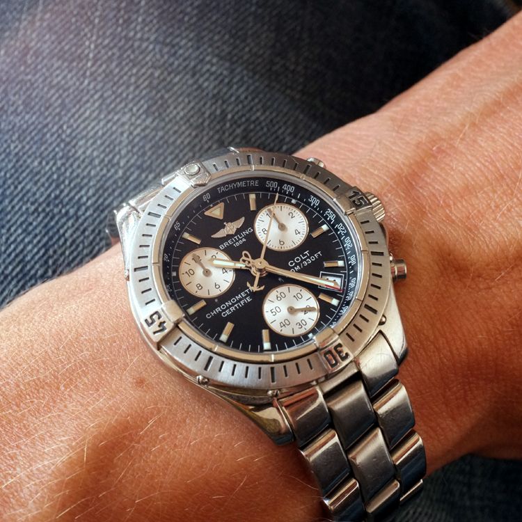 Het is een Breitling Colt Chrono, model 73350 van ongeveer tien jaar oud. Met een chrono ‘super’ quartz uurwerk, Breitling cal. 73 oftewel een ETA Thermoline 251.232. Voor mij een extra reden om het horloge te kopen. Ik heb in het verleden een Precista met een soortgelijk uurwerk gehad en deze beviel me erg goed. De chronograaf lijkt op een Lemania 5100, dus met een centrale minutenwijzer. Verder ben ik erg te spreken over de kwaliteit van het horloge. Alle onderdelen zijn echt super mooi afgewerkt. Waarschijnlijk laat ik hem binnenkort een beurtje geven maar vooralsnog loopt ie prima.