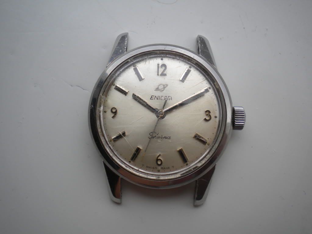 Deze Enicar loopt, maar zowel op de kast als op het glas zitten veel krassen. (Deze zijn op de foto’s goed te zien.)