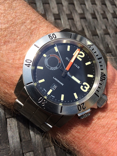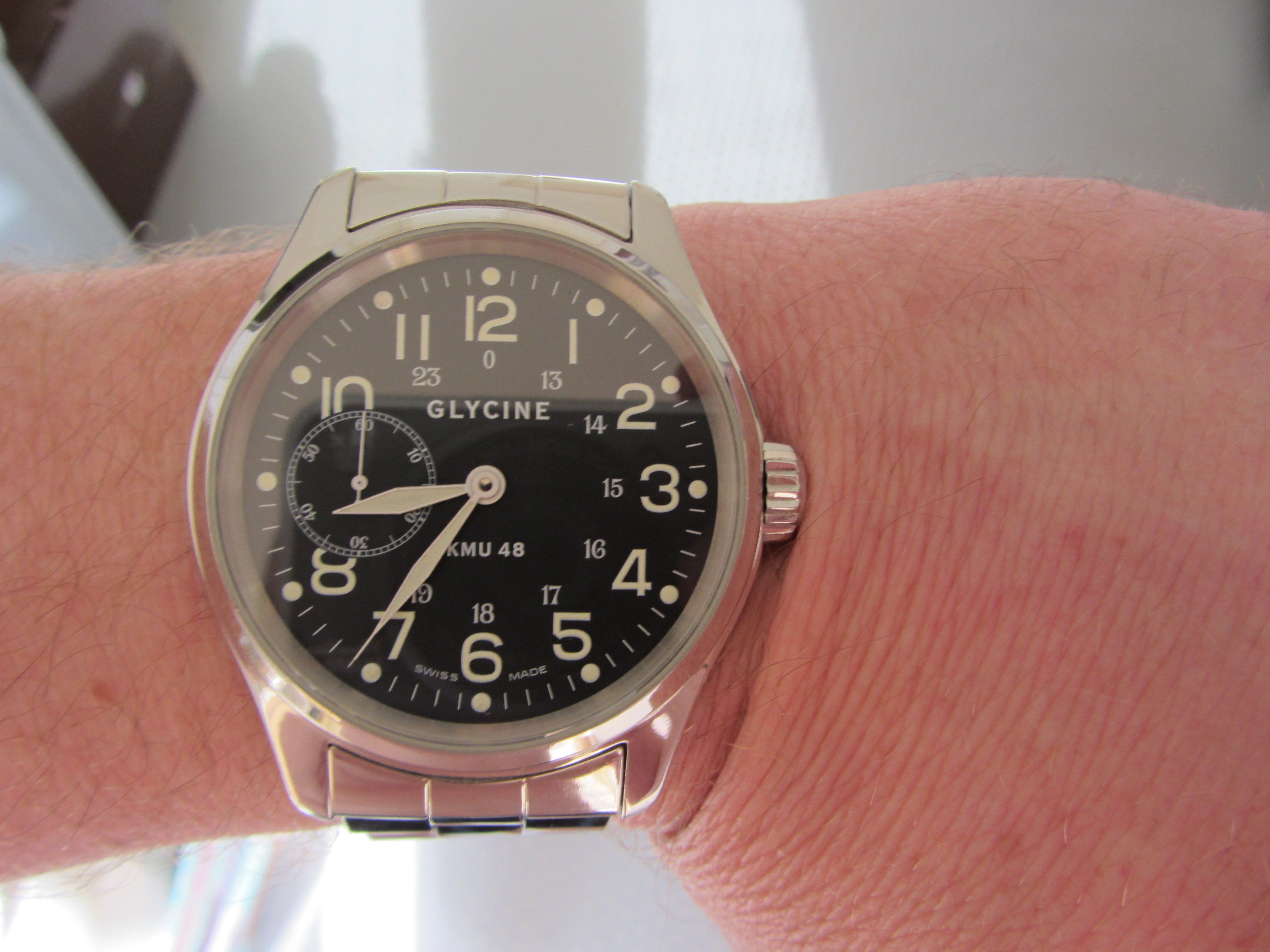 Gisteren door een ruil met een zeer prettig forumlid verkregen, mijn nieuwste aanwinst een Glycine KMU ( Kriegs Marine Uhr ) 48. Een flinke jongen maar ik ben er zeer blij mee